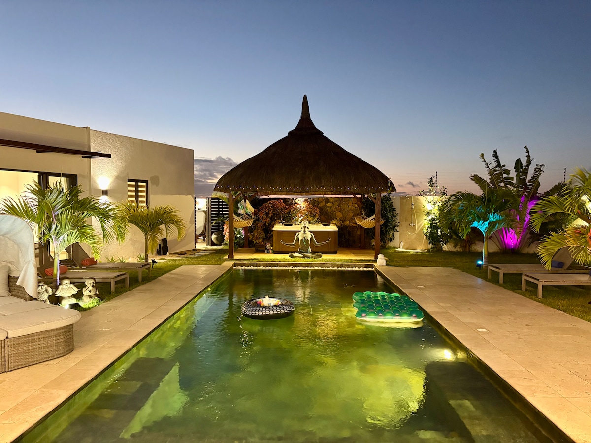 Entrez dans un petit coin de paradis tropical. Cette villa à deux pas des plages de sable fin et des eaux turquoise de l’île Maurice, vous accueille dans un cadre paisible, privé et élégant. Conçue pour allier confort moderne et charme mauricien, elle peut héberger jusqu’à 8 personnes dans 4 chambres. Au programme : journées farniente à la plage, moments de détente au bord de la piscine, et dîners conviviaux sur la terrasse, bercés par les couchers de soleil.