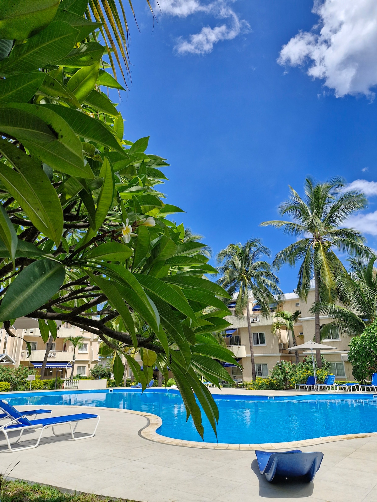 花园里有大游泳池,公寓有管理员。