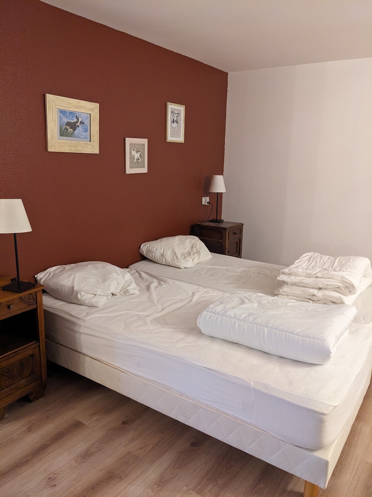 A l'intérieur de la maison d'hôte vous disposez d'une jolie chambre-studio avec entrée indépendante. Vous disposez de votre propre salle de bains et kitchenette. Il y a 1 lit simple, 1 fauteuil, 1 dressing et un bureau La chambre donne accès via un vestibule à la terrasse derrière pour les beaux jours où vous rencontrerez notre chienne Thaïs et nos 2 poules.