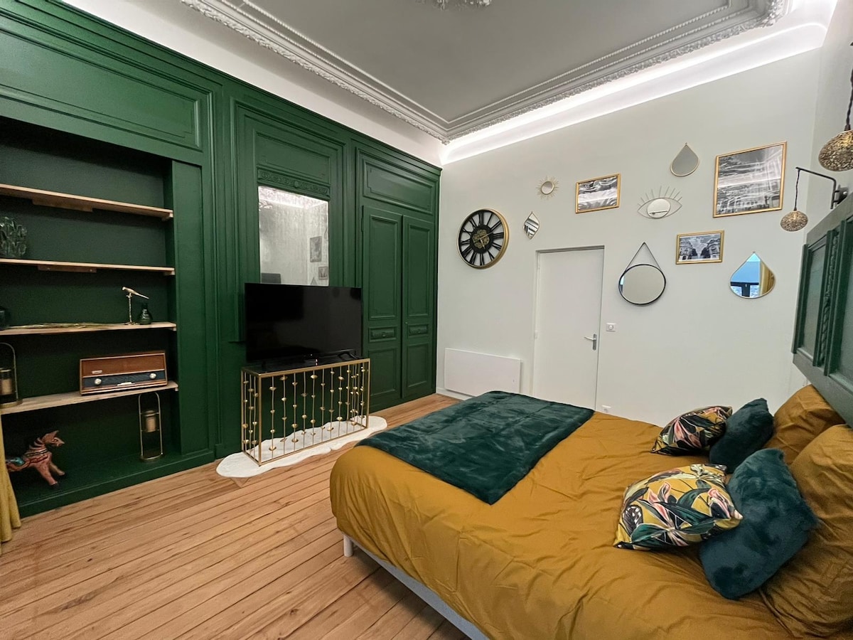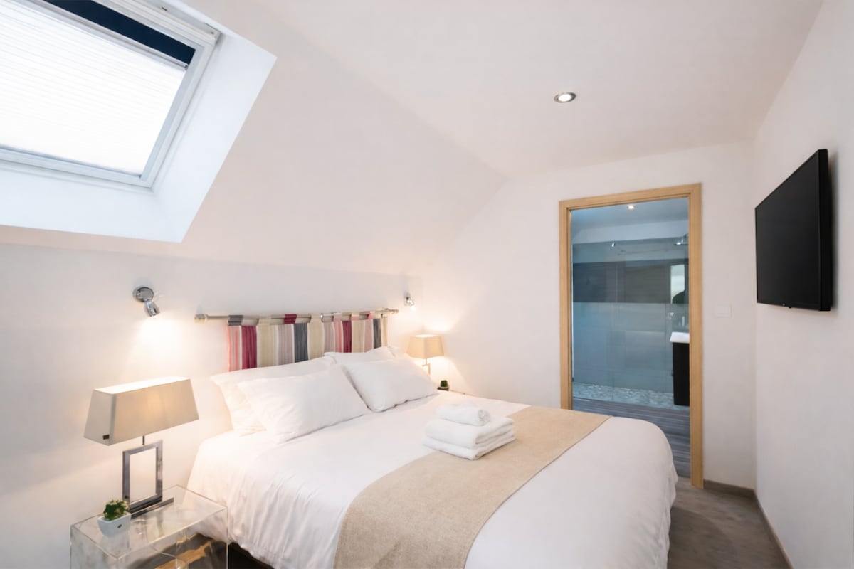 Appartement de 35m²avec baignoire balneo, pouvant accueillir jusqu’à 2 personnes, et qui possède tout un équipement haut de gamme: salle de bain privative avec douche massage en marbre et bambou, lit king size en 160×200. Pièce wc séparée de la salle de bain. Cuisine, réfrigérateur, grille-pain, machine à café, bouilloire, micro-ondes, fer à repasser, tv à écran plat avec Netflix, et une connexion wifi. Possibilité de prendre un petit déjeuner complet sur place.
