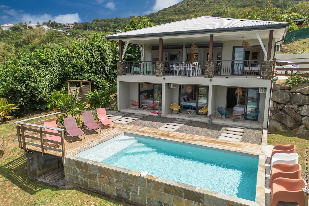 Magnifique vue sur la mer des Caraïbes ! Très belle villa, calme et reposante, située dans une résidence dès plus prisées, qui surplombe la grande baie. Les réveils sont lumineux et les couchers de soleil sont à couper le souffle. Le premier bain de mer à 4 mn en voiture. La villa est aménagée avec goût, des matériaux de qualité et totalement équipée. Piscine au sel. Jardin. BBQ. Localisation idéale pour rayonner partout sur l'île. Parking privé sécurisé pour 2 voitures. Supermarché à 5 minutes.