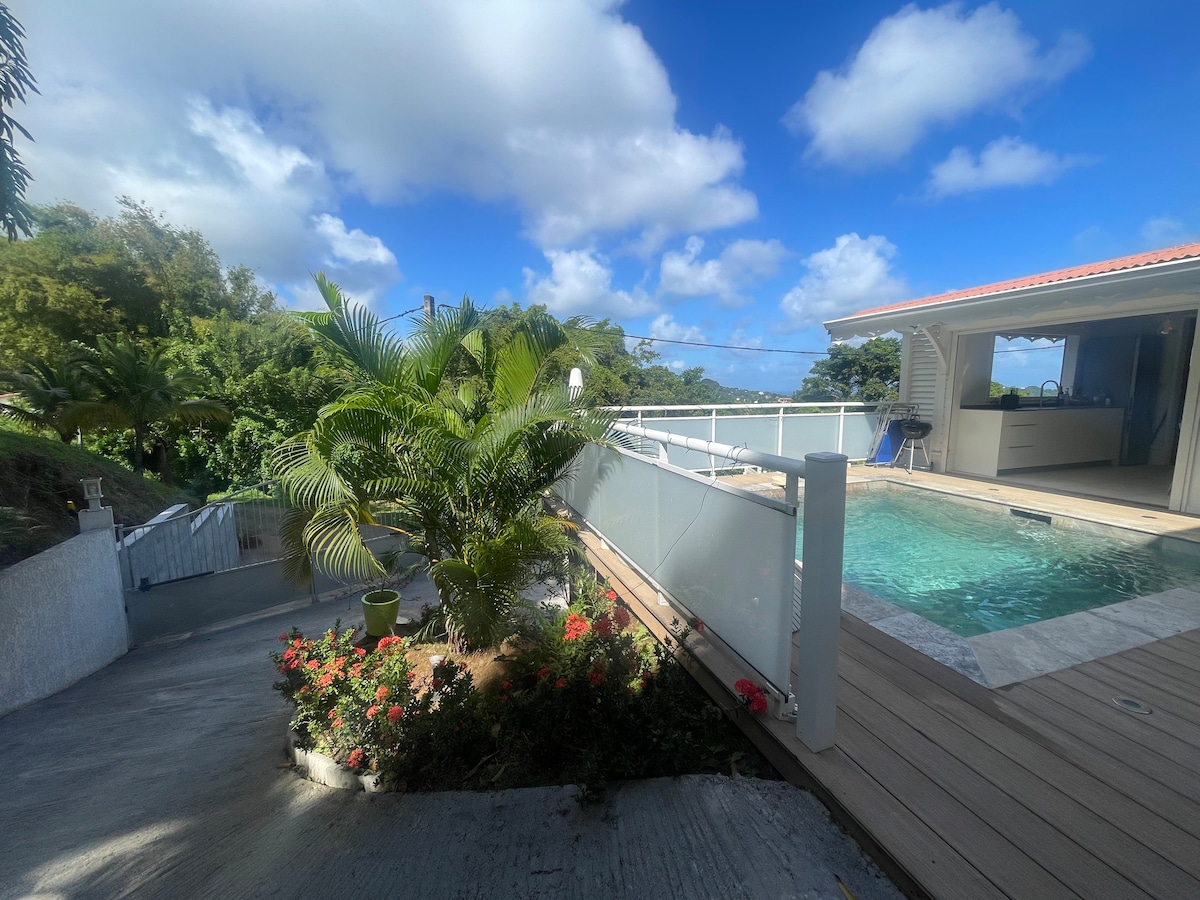 Magnifique vue sur la mer des Caraïbes ! Très belle villa, calme et reposante, située dans une résidence dès plus prisées, qui surplombe la grande baie. Les réveils sont lumineux et les couchers de soleil sont à couper le souffle. Le premier bain de mer à 4 mn en voiture. La villa est aménagée avec goût, des matériaux de qualité et totalement équipée. Piscine au sel. Jardin. BBQ. Localisation idéale pour rayonner partout sur l'île. Parking privé sécurisé pour 2 voitures. Supermarché à 5 minutes.