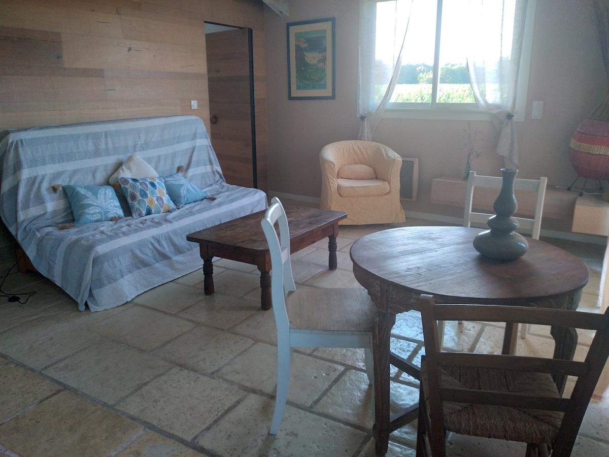 Venez poser vos valises dans cette petite dépendance de 30m2 climatisée à l'étage de notre maison ! Logement pour 2 personnes. Ou couple avec Bébé Située en plein cœur du centre bourg, proche de toutes commodités (supermarché,commerces, restaurants, Pizzerias, bar-tabac, pharmacie etc.), au calme au fond d'une impasse. A 20 min des plages ! Avec un arrêt de bus desservant les plages de Soustons, Capbreton, Hossegor (gratuit Juillet et Août), 25min de Biarritz et Bayonne et 45min de l'Espagne