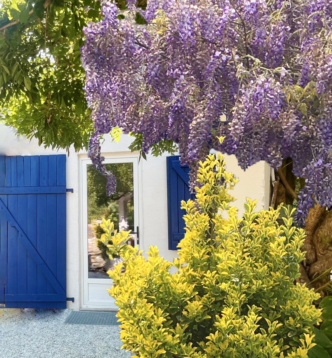 C'est une maison bleue adossée à la forêt