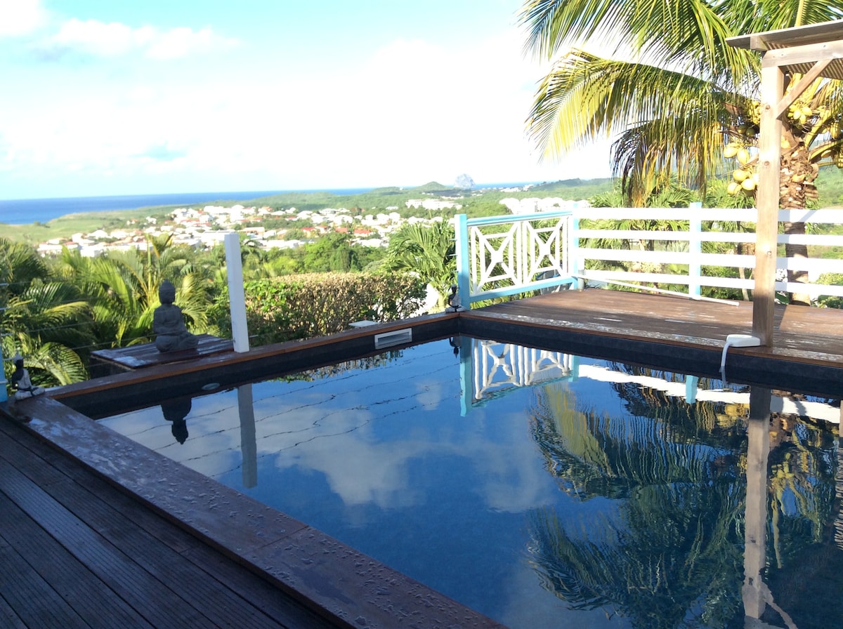 Updated, modern 3 AC bedroom, 2 bathrooms with private pool and view of Caribbean sea. 5 minute drive to beach, downtown Diamant with shops, restaurants, and markets. 20 minute drive from Fort de France airport. The villa is fully equipped with a washing machine, dishwasher, iron, coffee machine, toaster, blender, rice machine, bbq, 2 TVs, Apple TV, microwave, oven, fridge, etc. Hosts are native to Martinique and can provide recommendations for island sights. Perfect for families and couples.