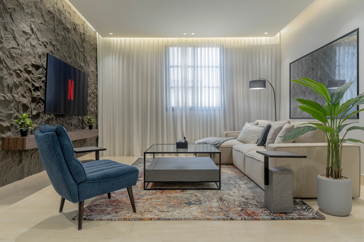 A luxury apartment next to Riyadh Season Boulevard, Hometel Residence building With a private external entrance and self-entry, consists -A living area with a billiard table, aesthetic natural plantings, a smart TV screen, a dining hall, a kitchen, and a guest bathroom, Outdoor session -kitchen (oven/ refrigerator/ microwave/ coffee maker/ kettle/ washing machine/ kitchen tools) -Master room with separate bathroom -Two bedrooms single beds, with a shared bathroom -Boulevard is just 5-minute walk