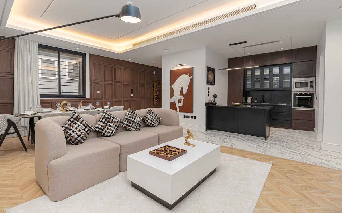هي بالفعل عصرية، وهي ملاذ دافئ، بطابع فندقي أنيق وفاخر، في شقة مكونة من غرفتين نوم، وغرفة معيشة مع طاولة طعام وغرفة سينما، ومطبخ مجهز، ودورتي مياه.. بلمسات مدروسة بعناية، تمنحكم تفاصيلها كل متطلباتكم، وتفي بكل توقعاتكم فيها.