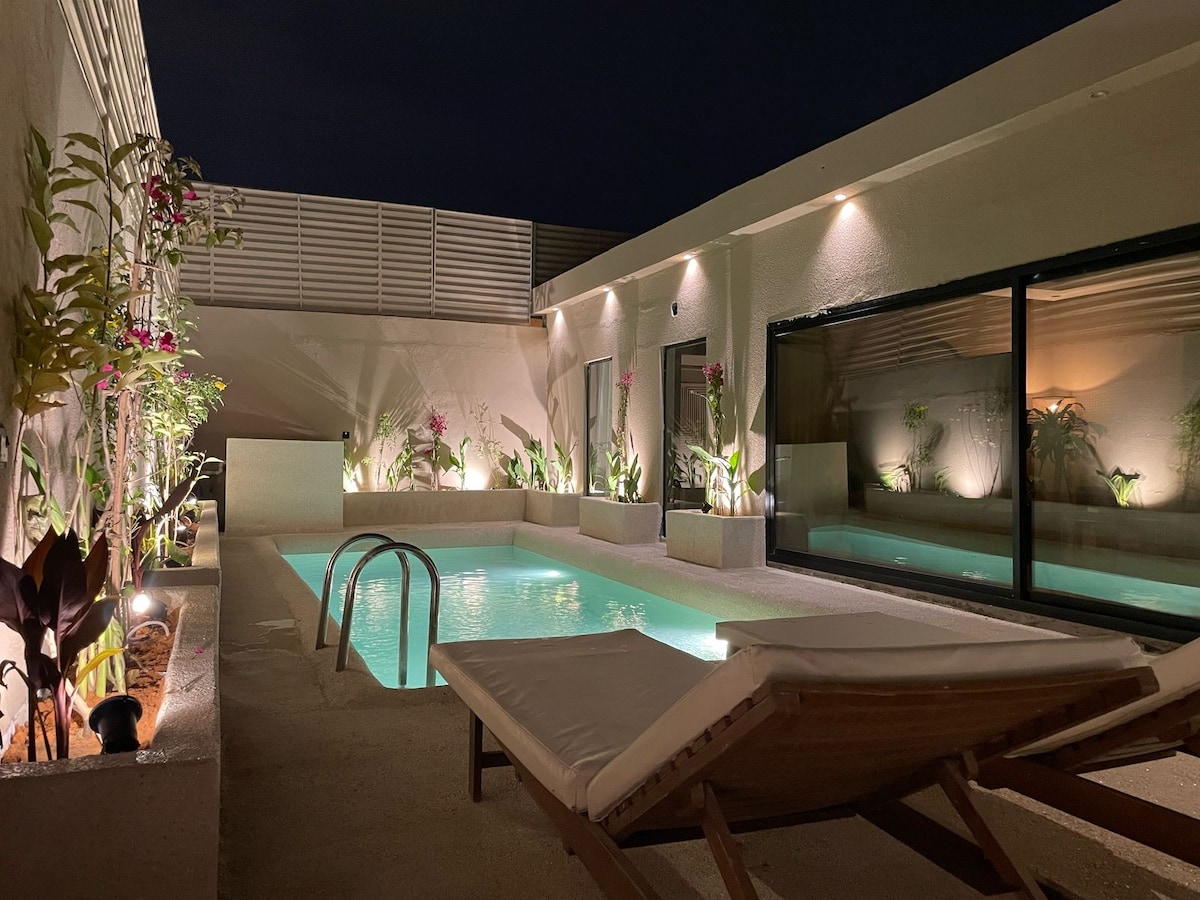 别墅有两个大厅、一间卧室、私人游泳池和阳台