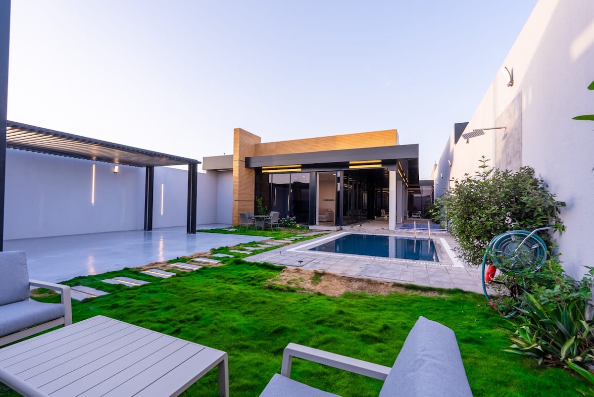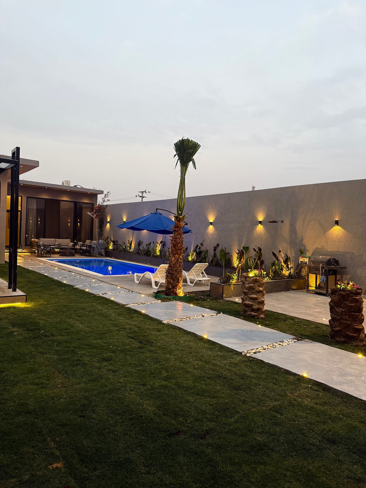 A luxurious 450 sqm villa combining elegance and serenity, ideally located on Al Thumama Road, just 15 minutes from King Khalid International Airport. Features a master bedroom with a king bed, a fully equipped kitchen, a stylish dining area, a private pool, and an outdoor seating surrounded by greenery. The perfect retreat for those seeking comfort, privacy, and relaxation. 🌿