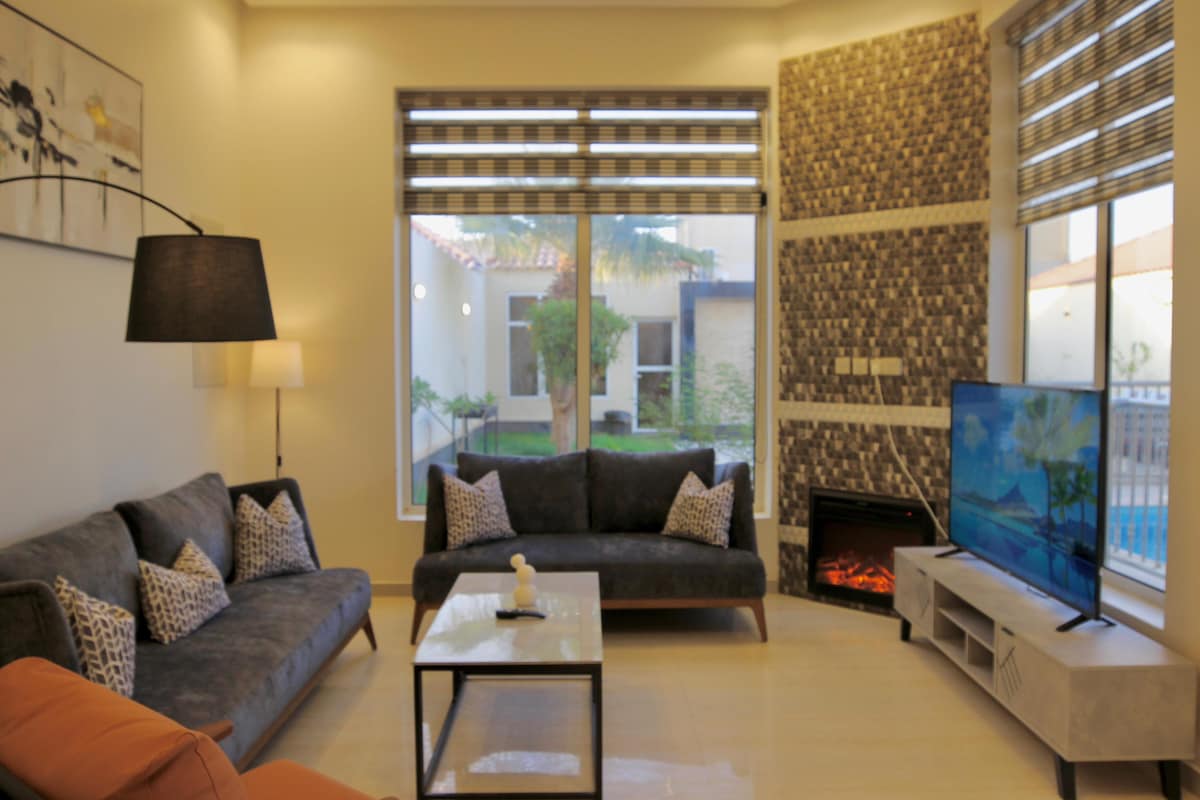 High luxury apartment with: 1- BBQ 2- Outdoor jacuzzi 3- private entrance + self entry 4- waterfall 5- garden 6-projector 7- coffee machine+popcorn maker 8- Kitchen with equipment 9- Hotel Robes, towels and slippers 10- Bose sound sys in all home شقة مودرن عصرية للاستجمام وراحة البال 1- شواية 2- ساوند سيستم كامل بالشقة 3- جاكوزي خارجي 4- مدخل خاص 5- شلال 6- حديقة 7- بروجكتر خارجي 8- قهوة ( بلاك + كبسولات ) + آلةالفشار 9- مطبخ بكامل التجهيزات 10- ارواب و سليبرات فندقية