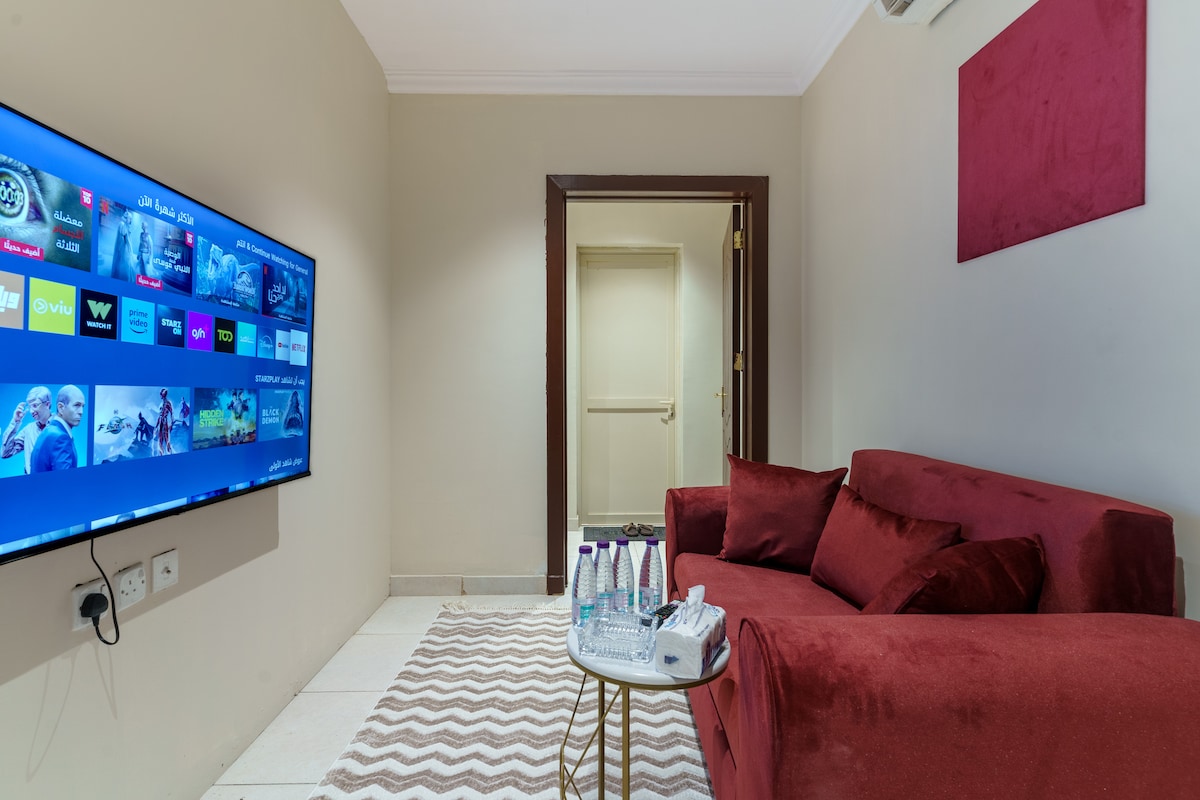 Modern apartment in the heart of Al-Murooj, Designed with a modern touch that blends hotel luxury with home comfort. Features 3 bedrooms: two with master beds and one with three single beds, plus a spacious living room with a 75” QLED TV and top streaming apps. Includes a fully equipped kitchen, high-speed fiber Wi-Fi, and secure self-check-in. Quiet, elegant area close to Riyadh Boulevard and KAFD. Family-friendly, ideal for business travelers. Free on-site parking. Close to cafes and markets.