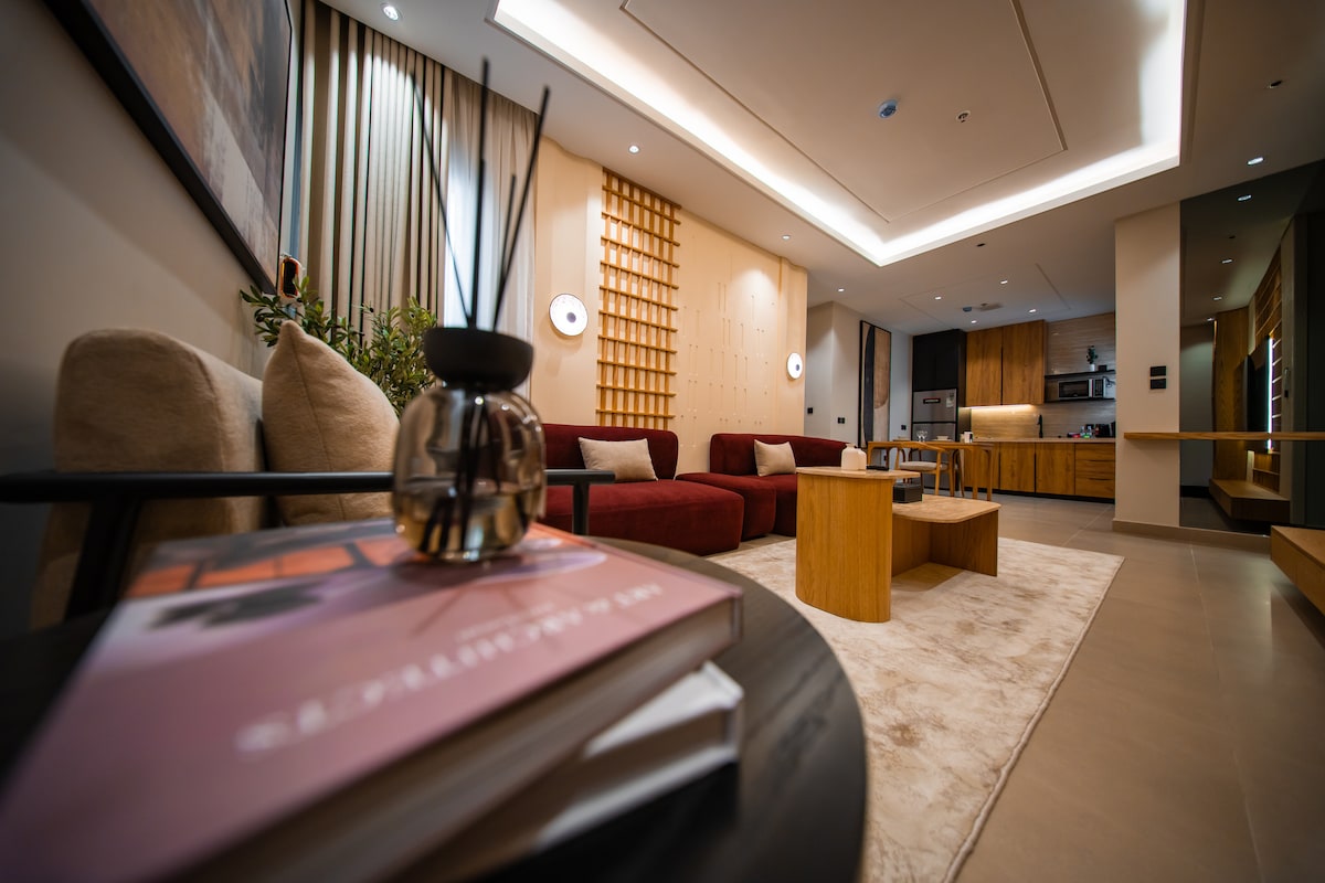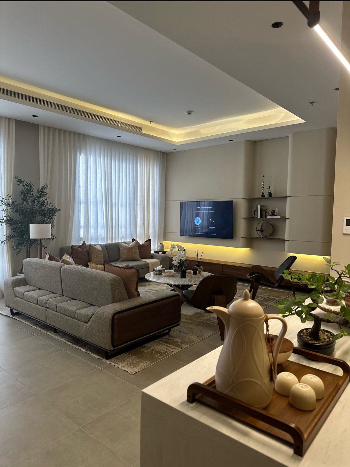 تقع هذه الشقة الفاخرة في قلب أحد أرقى أحياء الرياض، حيث تتناغم الأناقة العصرية والتكنولوجيا مع التصاميم الثقافية الأصيلة. تتميز الشقة بمساحاتها الواسعة التي تضفي شعوراً بالرحابة والراحة، وتتميز بتفاصيلها الدقيقة التي تعكس ذوقاً رفيعاً. جدرانها بأسقف عالية، تحوي حديقة وجلسة خارجية خلابة تبعث على الاسترخاء. تتميز الشقة أيضاً بإضاءة خافتة ودافئة تخلق أجواءً مريحة، وتحتوي على قطع أثاث فاخرة مصنوعة من أجود أنواع الرخام و الأخشاب. "تعتبر هذه الشقة ملاذاً مثالياً للاسترخاء والاستجمام والهدوء والذوق"