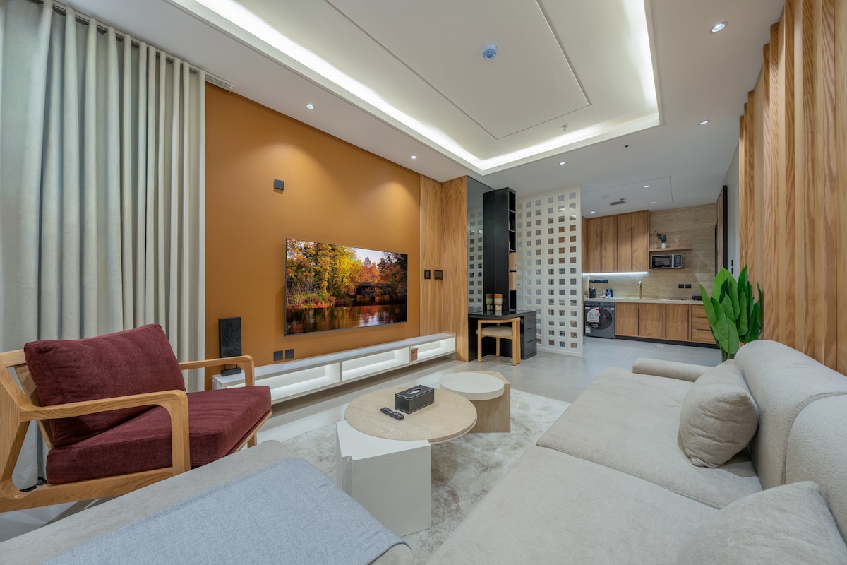 A luxury apartment next to Riyadh Season Boulevard, Hometel Residence building With a private external entrance and self-entry, consists -A living area with a billiard table, aesthetic natural plantings, a smart TV screen, a dining hall, a kitchen, and a guest bathroom, Outdoor session -kitchen (oven/ refrigerator/ microwave/ coffee maker/ kettle/ washing machine/ kitchen tools) -Master room with separate bathroom -Two bedrooms single beds, with a shared bathroom -Boulevard is just 5-minute walk