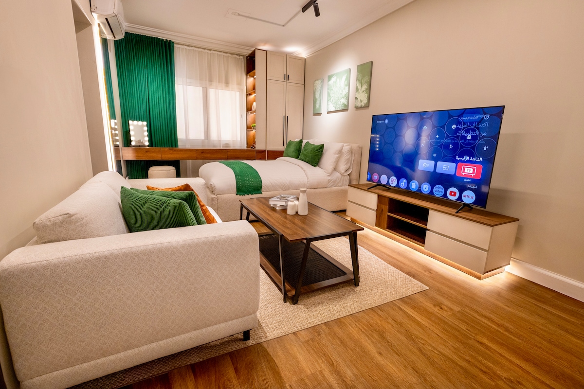 إقامة فاخرة في قلب الرياض، بالقرب من مطار الملك خالد ومحطة مترو اليرموك، بموقع مثالي يتيح وصولًا سريعًا لأهم معالم المدينة. غرفة مع صالة مودرن أنيقة وهادئة بتصميم عصري، يضم سريرًا ناعماً ومخدات فندقية مريحة، مع كنب كبير وشاشة QLED عالية الجودة. ايضا يوجد بانيو او باث توب بمكان مخصص له ووجود مستلزماته كما يتيح لك مشاهدة التلفاز والاسترخاء . 5G وإنترنت , YouTube, Netflix, OSN استمتع باشتراكات سريع ومستقر . تتوفر ميزة العزل الصوتي، الدخول الذاتي، ومواقف مجانية امام العمارة وفي القبو .