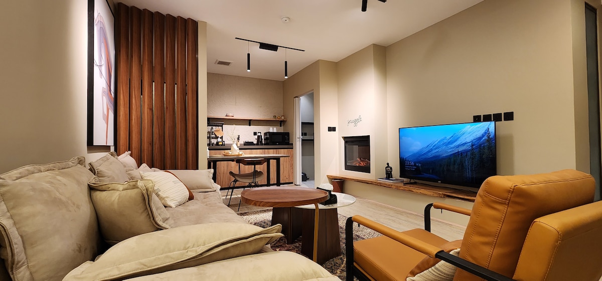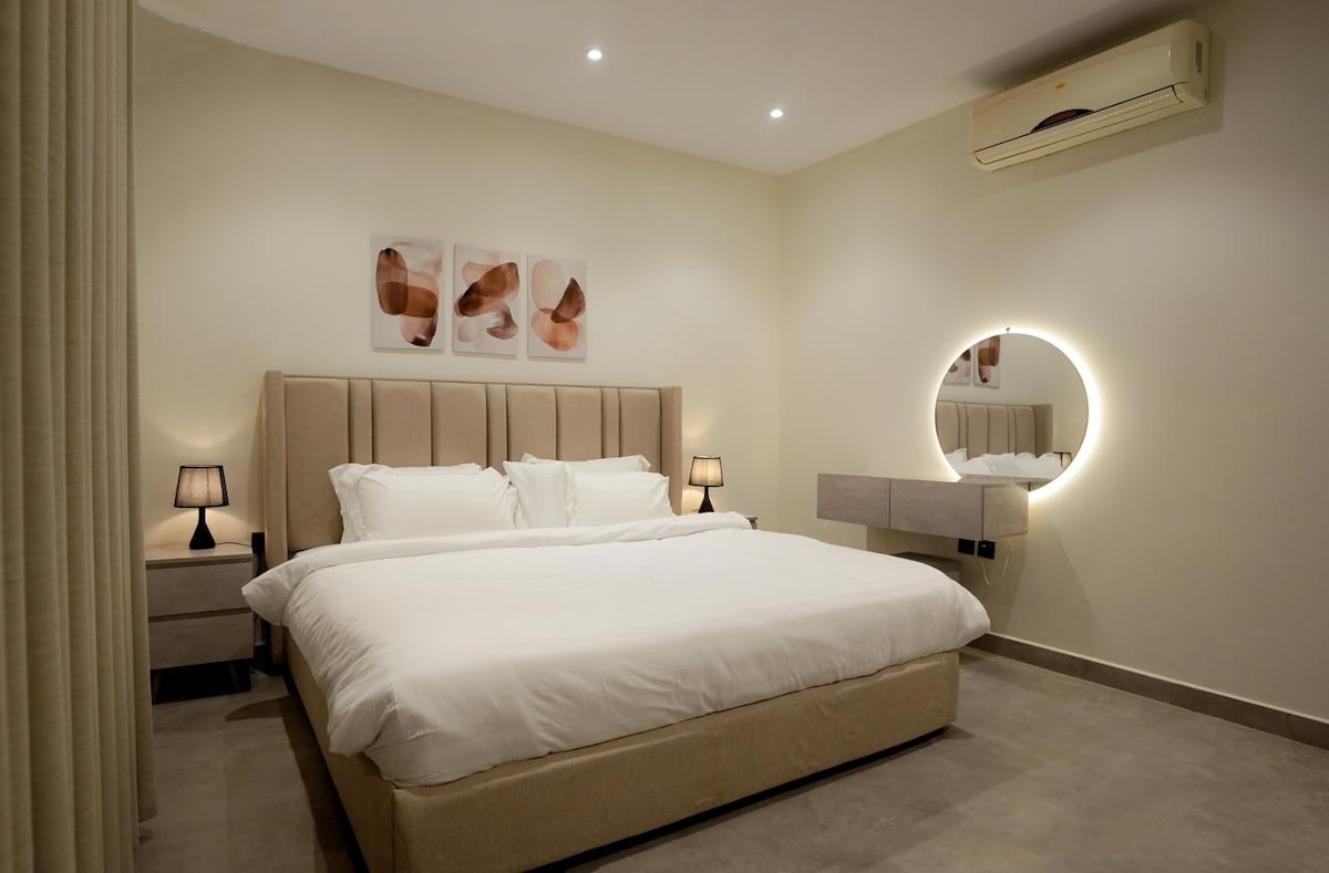 Enjoy a stylish experience at this North-located place in Al Malqa. Comes with smart lock and door isolation for extreme comfortable stay. Located in the north of Riyadh and just 20 minutes from the airport, 5 minutes from Riyadh season entertainments zones and 10 minutes from Al-Diriyah historic town. The apartment comes with high speed fiber internet, 65 LED 4K TV, KING size bed with extra mattress pad for comfortable sleep and free parking.