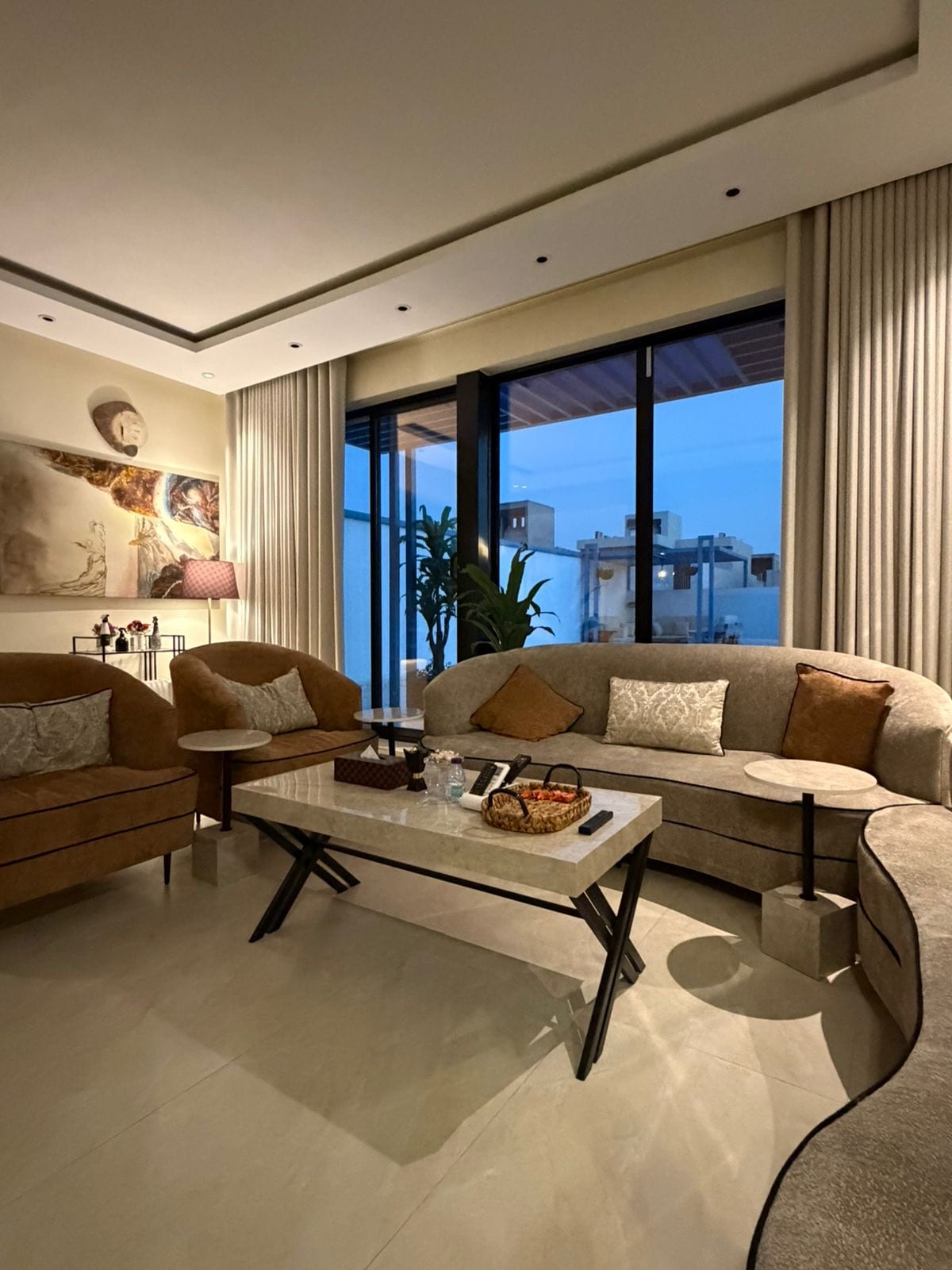 Luxury flat in North Riyadh (Al-Tawaan), fully furnished with modern design. Features 3 bedrooms, a cozy private backyard, and smart access. Located on the ground floor of AlMajdayh semi-compound with private entry from basement parking or public gate. Quiet and well-served street. Just 10 mins from Winter Wonderland, 15 mins from Boulevard & The Groves, and 18 mins from airport. Includes Wi-Fi & smart TV