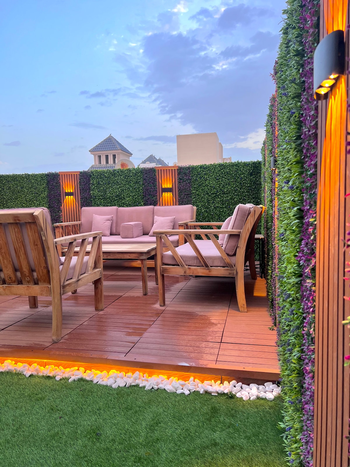 High luxury apartment with: 1- BBQ 2- Outdoor jacuzzi 3- private entrance + self entry 4- waterfall 5- garden 6-projector 7- coffee machine+popcorn maker 8- Kitchen with equipment 9- Hotel Robes, towels and slippers 10- Bose sound sys in all home شقة مودرن عصرية للاستجمام وراحة البال 1- شواية 2- ساوند سيستم كامل بالشقة 3- جاكوزي خارجي 4- مدخل خاص 5- شلال 6- حديقة 7- بروجكتر خارجي 8- قهوة ( بلاك + كبسولات ) + آلةالفشار 9- مطبخ بكامل التجهيزات 10- ارواب و سليبرات فندقية