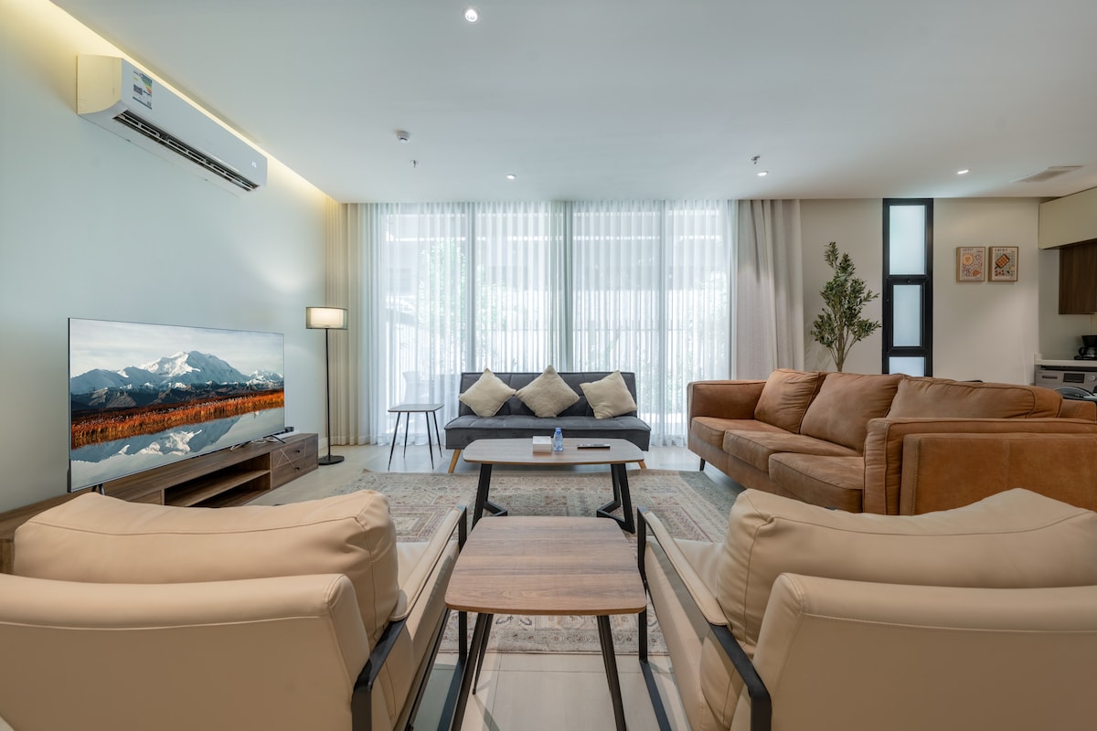 Experience unmatched luxury in this elegant wooden-designed apartment in Al Yasmin, just steps from Olaya Main Road. Enjoy 3 spacious bedrooms, a stylish living room, and a private backyard with stunning tower views. Perfect for families and travelers seeking comfort, privacy, and prime location. Every detail is thoughtfully crafted for a warm, upscale stay in the heart of Riyadh.
