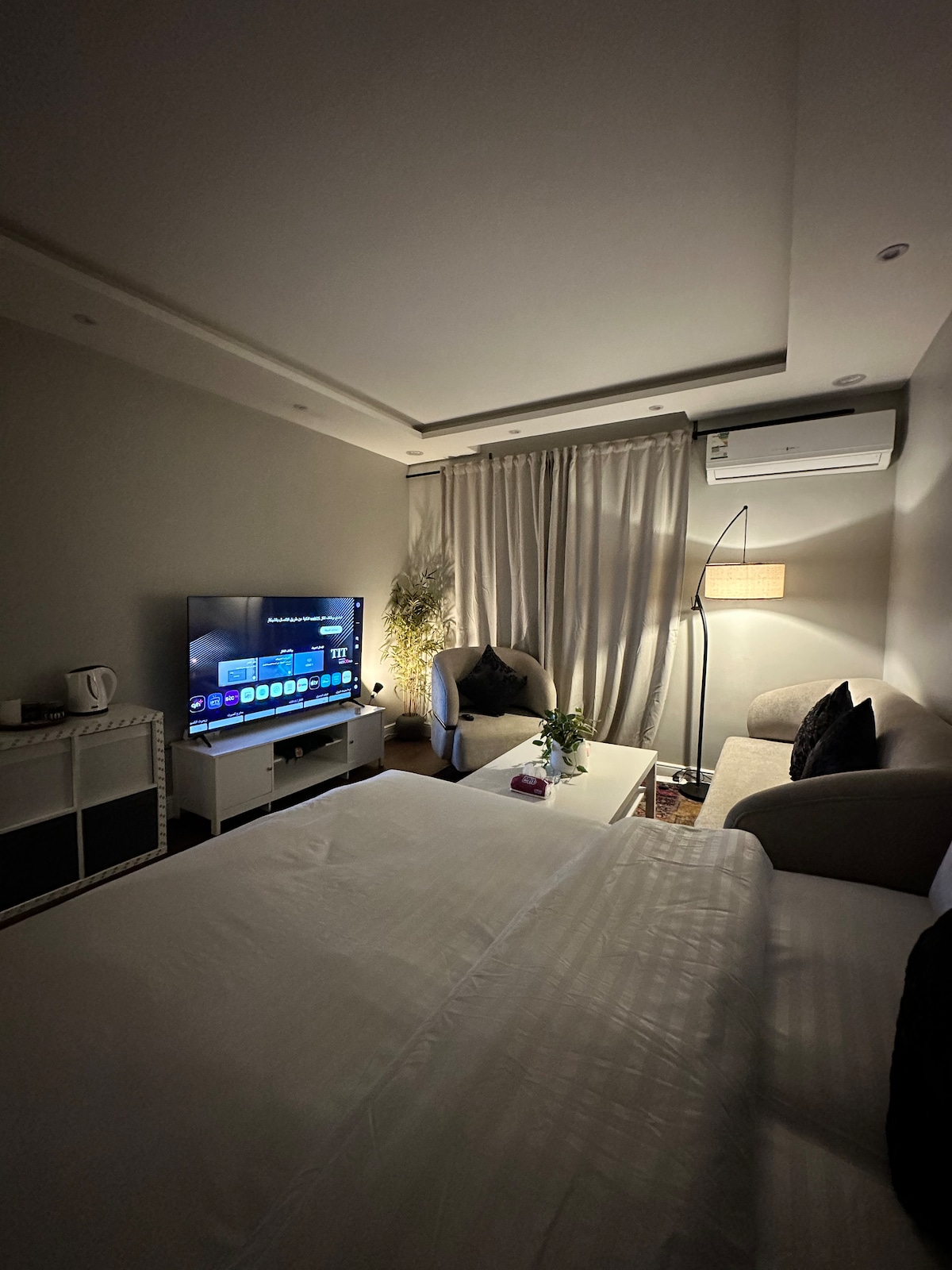 Modern 1BR in Hittin, one of Riyadh’s prime locations, minutes from Boulevard City and top cafes. Designed for comfort and ease with self check-in and a full smart system. Features a cozy living area, comfortable bedroom, 85” Smart TV, and an elegant electric fireplace for a relaxing atmosphere. Fully equipped kitchen with oven, microwave, electric stove, dishwasher, and washing machine. Clean, stylish, and ideal for couples, business travelers, and short or extended stays.