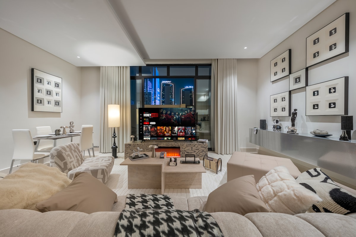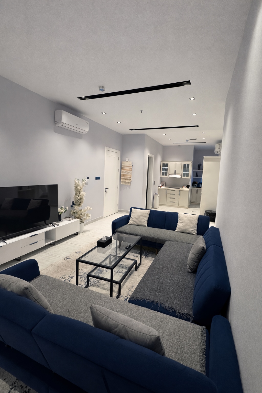 SOLID – Iconic Glass Landmark | Luxury Design Residence A refined luxury apartment designed with clarity and comfort in mind. Features two king-size beds with hotel-grade quality, a spacious living area with a soft white sofa, and an immersive 85-inch TV. Includes a dedicated work space, a fully equipped coffee corner, and a modern kitchen with all essential appliances. Set within a striking glass-and-marble building, offering a clean, elegant, and premium living experience.