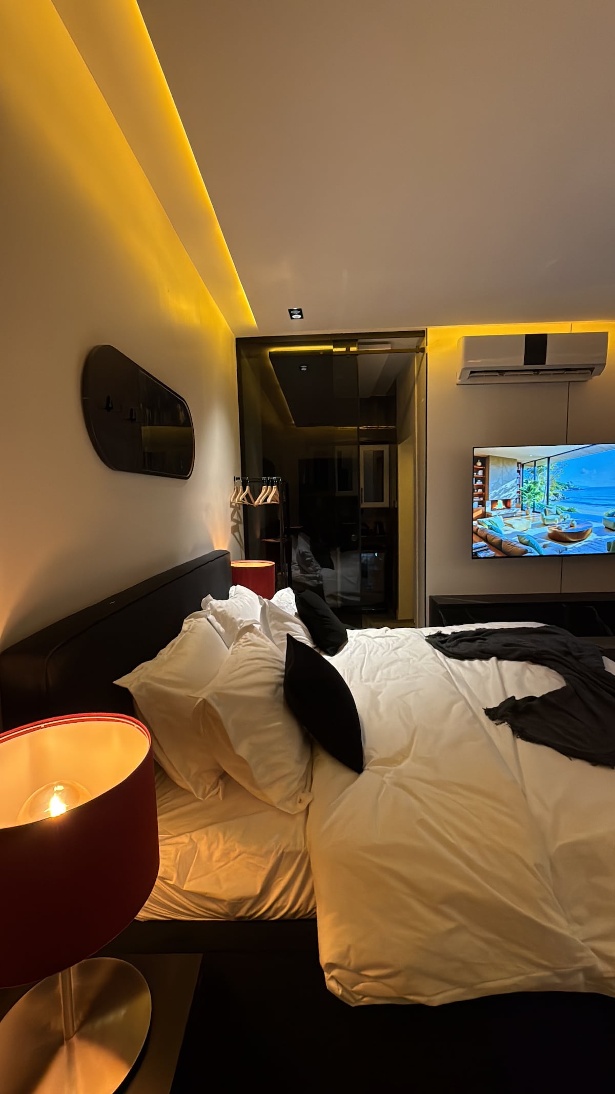 إقامة فاخرة في قلب الرياض، بالقرب من مطار الملك خالد ومحطة مترو اليرموك، بموقع مثالي يتيح وصولًا سريعًا لأهم معالم المدينة. غرفة مع صالة مودرن أنيقة وهادئة بتصميم عصري، يضم سريرًا ناعماً ومخدات فندقية مريحة، مع كنب كبير وشاشة QLED عالية الجودة. ايضا يوجد بانيو او باث توب بمكان مخصص له ووجود مستلزماته كما يتيح لك مشاهدة التلفاز والاسترخاء . 5G وإنترنت , YouTube, Netflix, OSN استمتع باشتراكات سريع ومستقر . تتوفر ميزة العزل الصوتي، الدخول الذاتي، ومواقف مجانية امام العمارة وفي القبو .