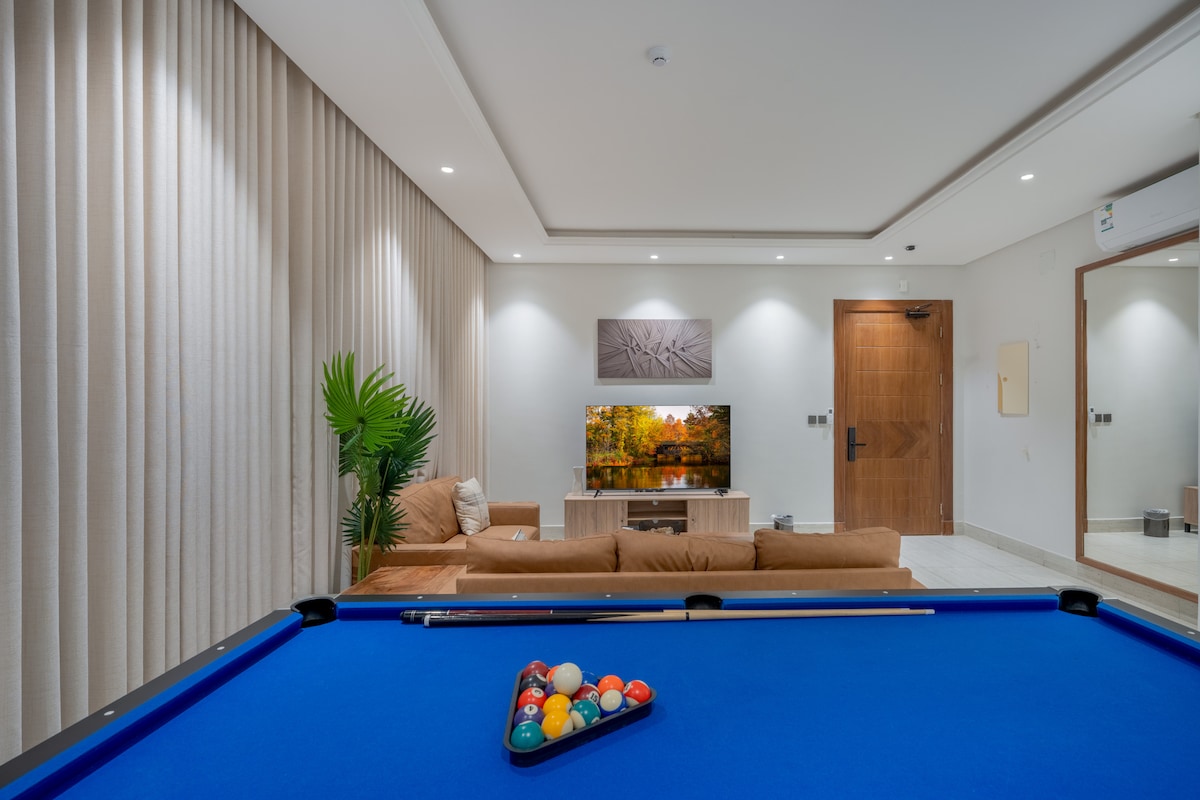 فلة مودرن ثلاثة ادوار بمدخل خاص للسيارة و( دخول ذكي ) وحديقة خارجية مع جلسة و مسبح خاص بالفله بالاضافة الى عامل للفله وغرفة خادمة+ صالة 8*7 بشاشة 85 بوصه سامسونج سنمائية مطلة ع الحديقة والمسبح+انترنت 4G 5G بالاضافة الى شتر لحجب ضوء الشمس+كورنر كوفي مع كامل اجهزته+مطبخ متكامل ( جميع ما تحتاجه للاستمتاع والاستجمام ) A modern villa, three floors, with a private entrance to the car, an outdoor seating with a sitting and a private pool for the villa ( everything you need for fun and relaxation )