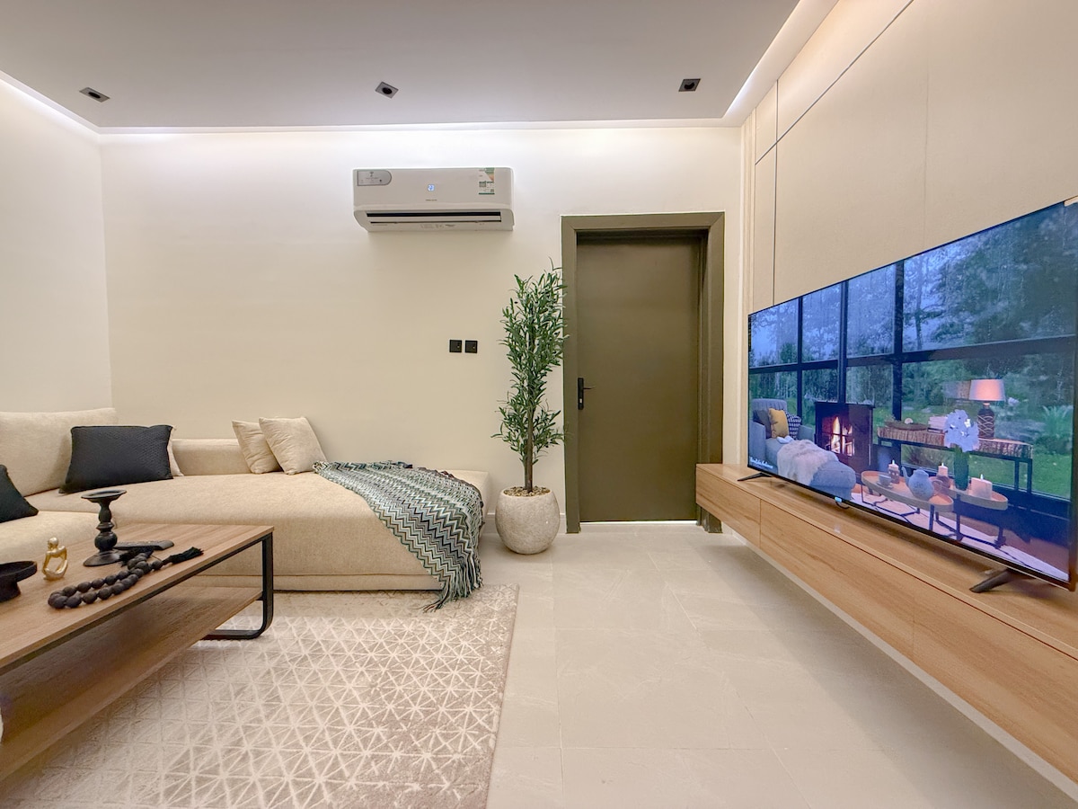 A modern apartment designed for an exceptional stay, located in one of Riyadh’s finest neighborhoods with a stunning view of KAFD. It features an outdoor seating area with a screen and projector for enjoyable evenings. For your comfort, the bed includes a high-quality 14cm extra layer. “We also offer event coordination services for special occasions (including cake and accessories) for an additional fee with prior booking, ensuring an unforgettable experience “