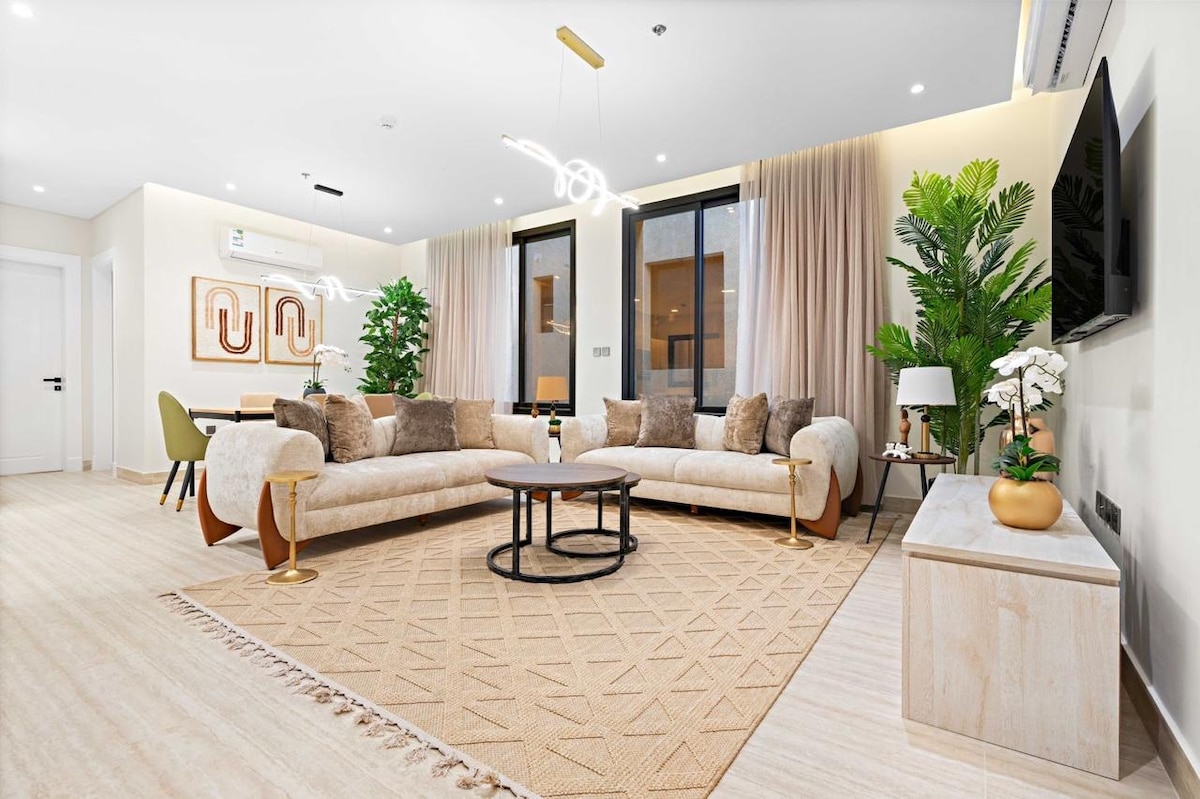 Discover a chic bohemian retreat in Riyadh ✨ A cozy 3BR apt designed for groups, families, and business travelers. With warm décor, spacious interiors, and access to amenities, this home blends comfort with convenience just 5 minutes from Riyadh Convention Center (RICEC). Unwind in a design-forward living space, enjoy restful nights with premium bedding, or take advantage of the pools and gyms. Whether you’re here for work or leisure, this apartment makes every stay feel easy and memorable.