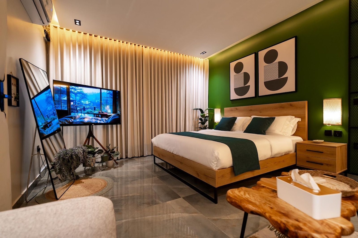 Boho-style retreat in Al Narjis! Cozy 1BR apartment with living area, equipped kitchen, 2 bathrooms, and a 4-seat dining table. Natural plants add freshness, soft lighting and warm tones create a relaxing vibe. Perfect for solo travelers, couples, or short stays. Fast Wi-Fi, AC, and parking included. Enjoy comfort, style, and a peaceful Riyadh stay in a brand-new, inviting space.
