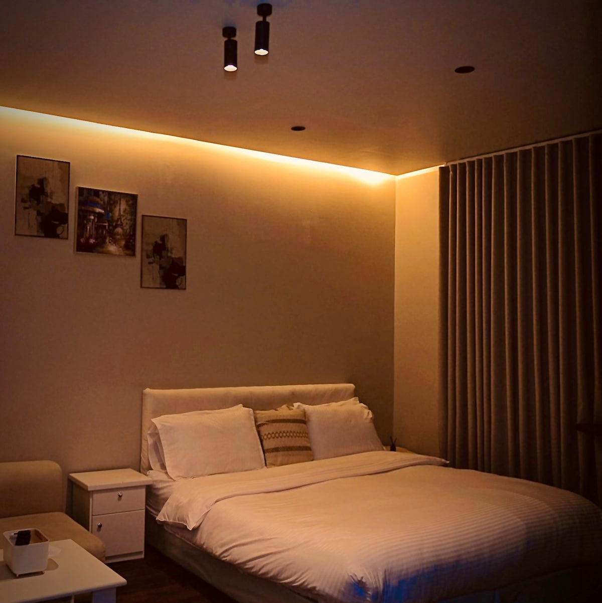 A Wide Luxury & New Hotel Studio in a quiet and prime location •Self check-in •WiFi •High-quality comfortable sofa •Luxury coffee corner •Parking •Hotel amenities •Fully equipped kitchen Location highlight: •Central location, Just 1 km from the Northern Ring Road •12min. to airport •15min. to Financial District •5min. to Nakheel Mall •15–20min. to Riyadh Season venues and Boulevard •10–15min. to Imam University, Princess Nourah University, and the Electronic University •Daily cleaning