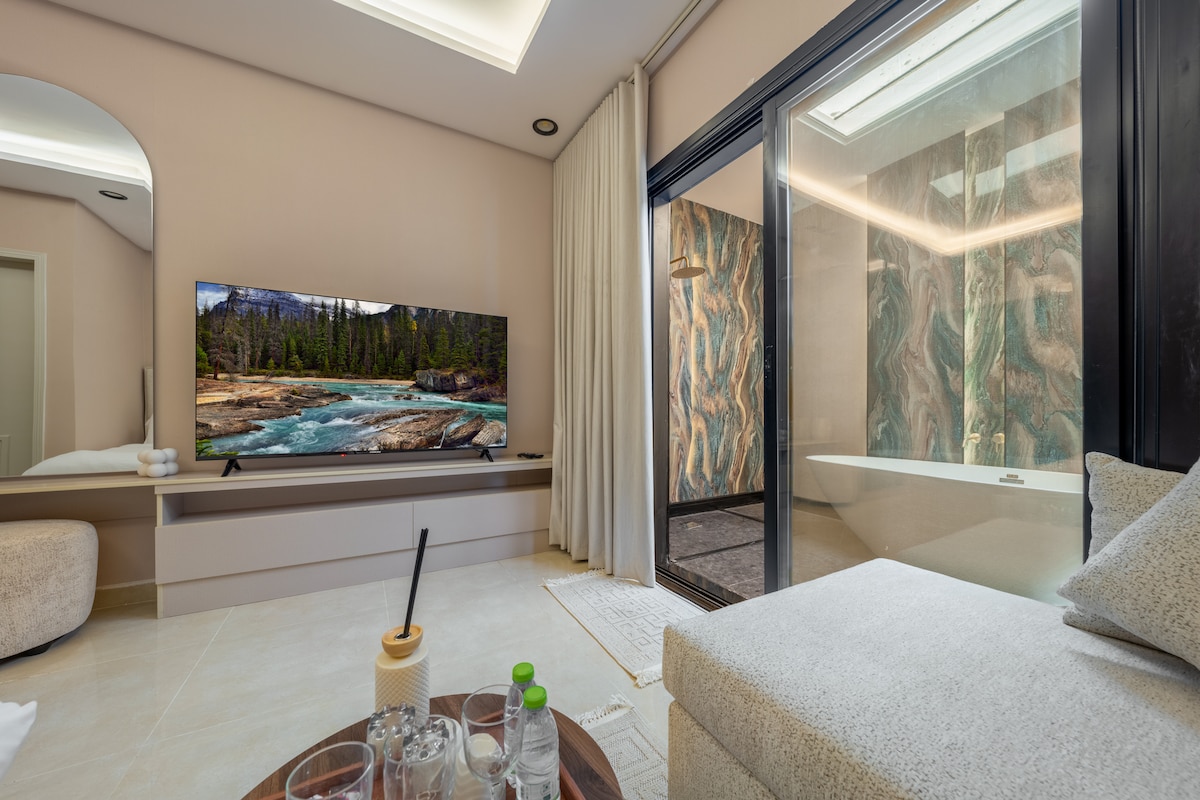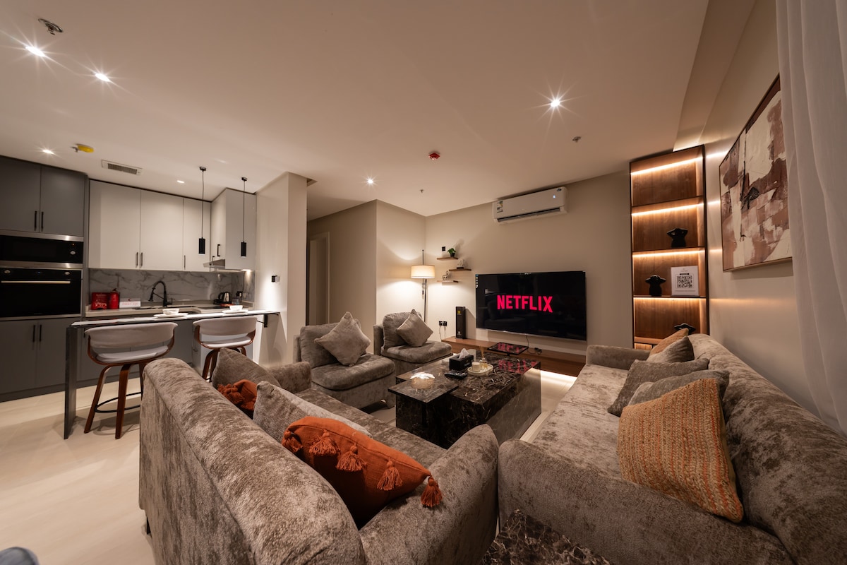 A New luxury hotel suite in quiet, prime Al Taawun. • Self check-in • Bathtub “banio” • Extra sitting area • Wi-Fi • Medical mattress • Premium comfy sofa • Ground parking • Hotel amenities • Full kitchen • Location: Central North Riyadh, 1 km to Northern Ring Rd; 12 min airport; 15 min Financial District & Riyadh Season/Boulevard; 10–15 min to Imam Univ., Princess Nourah & SEU. • Note: Daily hotel-style cleaning at guest-convenient times.