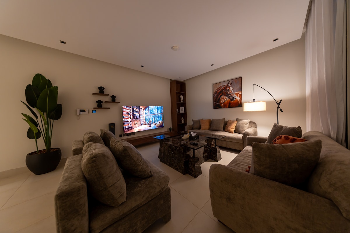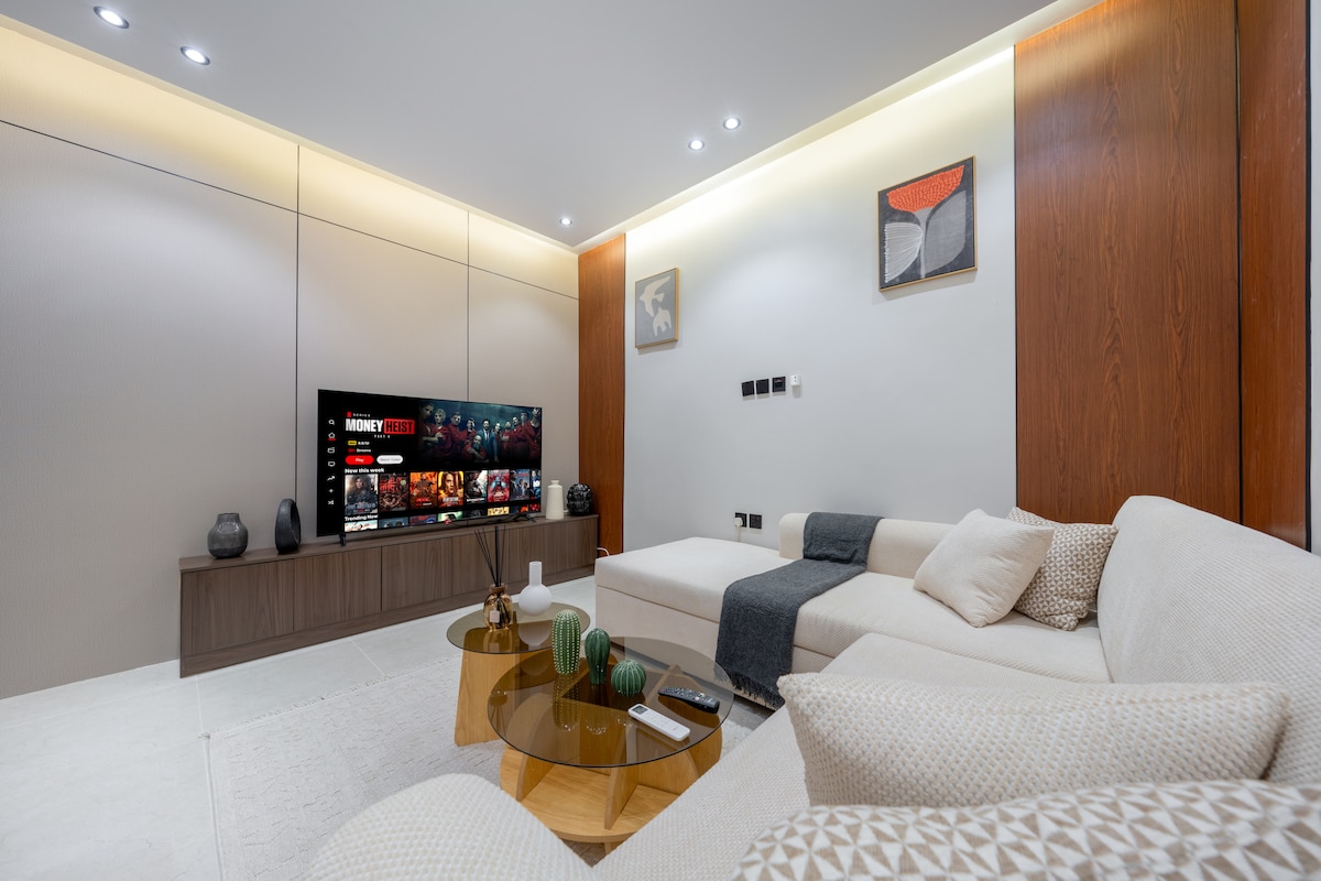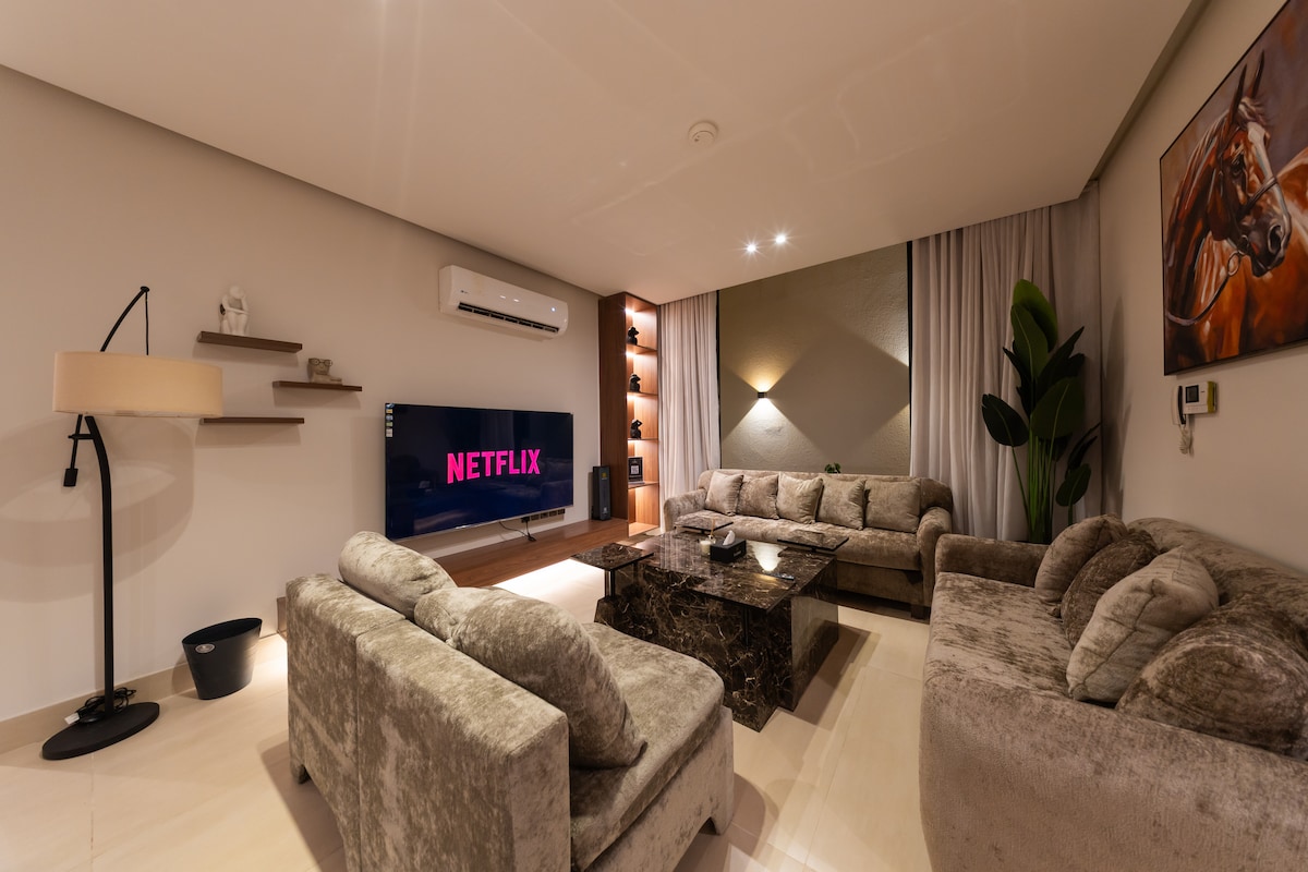 للحصول على خصم خاص للإيجار الشهري يُرجى التواصل قبل الحجز 🙏🏼 تمتع بالإقامة في شقة مكونة من غرفتين نوم و دورتين مياه ، ومطبخ كامل مجهز بفرن وبالإضافة الى ضيافة مجانية و يوجد ايضا غرفة سينما اضافية وتتكون من كنبة بمرتبة للاستمتاع بمشاهدة الافلام على نيتفليكس و يمكنك الاسترخاء في منطقة المعيشة التي تضم جلسة مريحة و تلفزيون بشاشة مسطحة كبير جدًا وطاولة بلياردو لجعل إقامتكم اكثر متعه! وجلسة خارجيه . يضعك موقعنا المتميز في قلب الحدث مع سهولة الوصول الأماكن السياحية في الرياض بالقرب.
