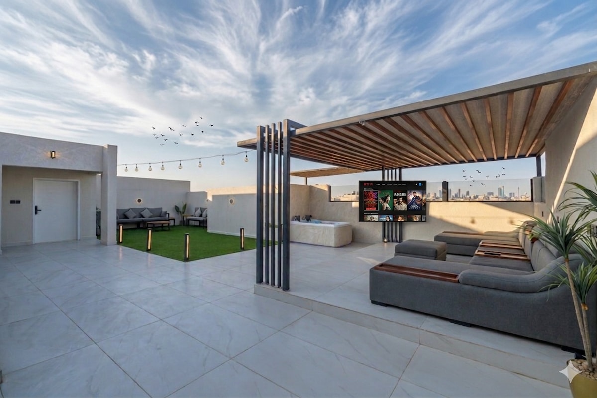 Luxury 2BR apartment with a private rooftop jacuzzi in Al Malqa, North Riyadh. Enjoy a stylish stay featuring a 75" QLED Smart TV with Netflix, Disney+, Shahid, and OSN. The rooftop offers a beautiful view, outdoor seating, and a cooling mist system for a refreshing atmosphere. High-speed fiber Wi-Fi, coffee machine, electric oven, and self-check-in. Perfect for couples and relaxing rooftop evenings.