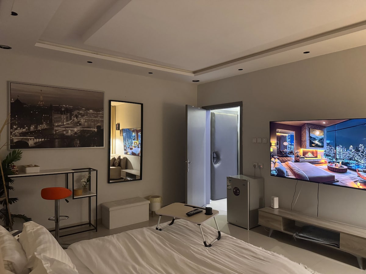 For all movies - watchers! Enjoy a special experience at the modern "Movie Night Theme" studio in the heart of Al Sahafah district. As you will find a 70-inch screen for enjoyable viewing on your favorite platforms: Netflix, Shahid, Starz On, YouTube, and more, with 5G internet access.