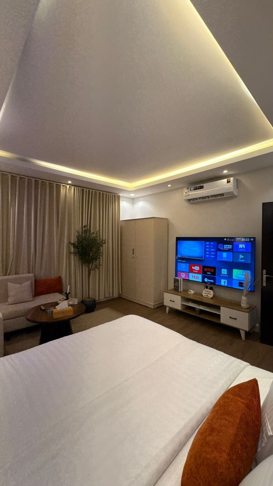 Cozy and luxurious apartment designed by Architect Khaled, located near Boulevard and close to the Financial Center (KAFD). Features a simulated fireplace that adds a warm and inviting ambiance. Includes a bedroom with a comfortable seating area, a stylish dressing room with a uniquely designed makeup vanity, and a spacious wardrobe. The apartment boasts a sophisticated and comfortable design, perfect for modern living.