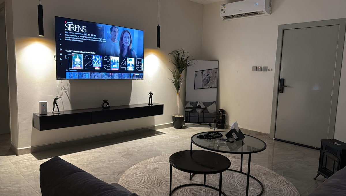 High luxury apartment with: 1- BBQ 2- Outdoor jacuzzi 3- private entrance + self entry 4- waterfall 5- garden 6-projector 7- coffee machine+popcorn maker 8- Kitchen with equipment 9- Hotel Robes, towels and slippers 10- Bose sound sys in all home شقة مودرن عصرية للاستجمام وراحة البال 1- شواية 2- ساوند سيستم كامل بالشقة 3- جاكوزي خارجي 4- مدخل خاص 5- شلال 6- حديقة 7- بروجكتر خارجي 8- قهوة ( بلاك + كبسولات ) + آلةالفشار 9- مطبخ بكامل التجهيزات 10- ارواب و سليبرات فندقية