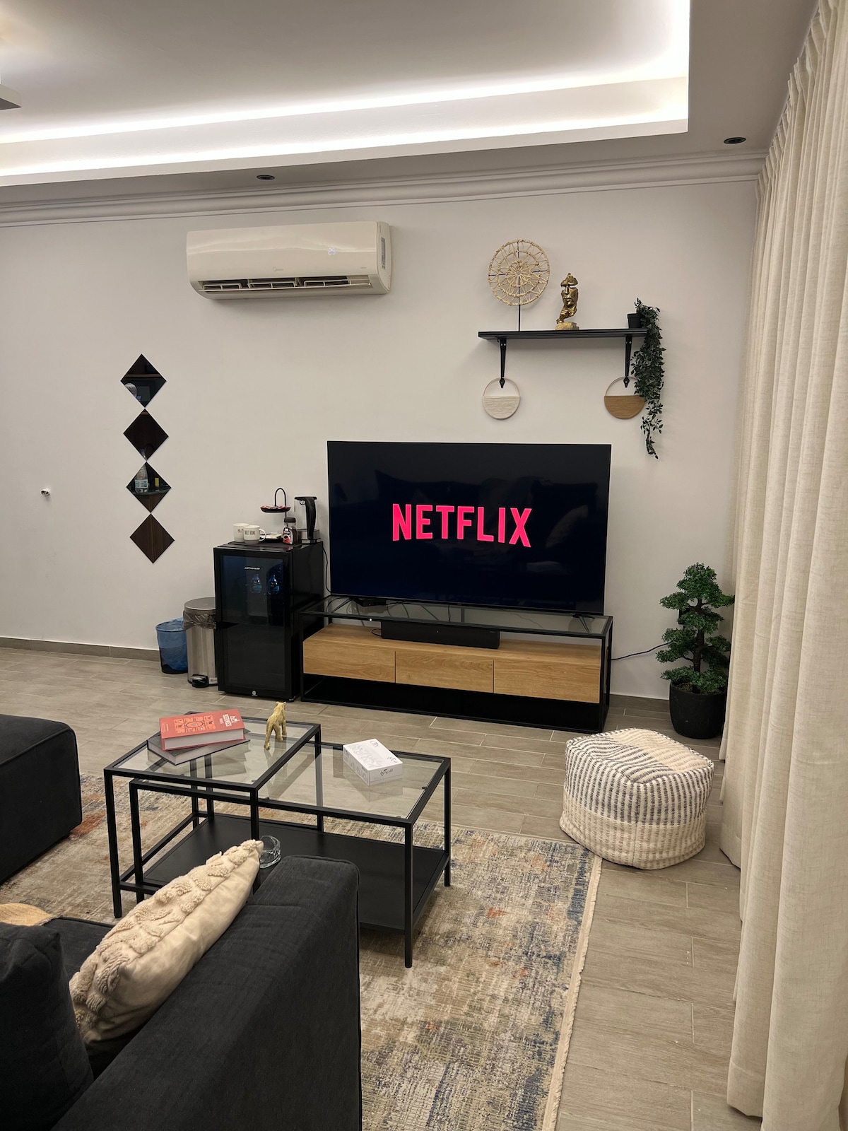 Enjoy a comfortable stay in this stylish property with a spacious living room, 75-inch TV, coffee corner, private bedroom, bathroom, and small service kitchen. Guests have full access to the property. I’m always available for questions while respecting your privacy. No smoking, pets not allowed, parking and Wi-Fi provided.