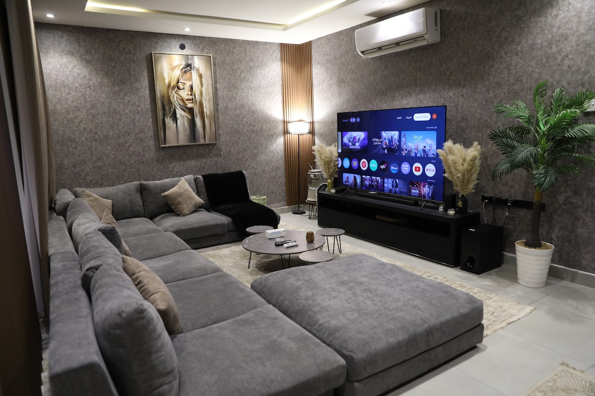 Indulge in luxury at our elegantly designed apartment in the heart of Riyadh. This spacious retreat features modern amenities, a private cinema, and a cozy outdoor seating area for two. perfect for discerning travelers seeking comfort and style. Enjoy nearby attractions, fine dining, and shopping, all within walking distance. Experience urban living at its finest with us. Close to Boulevard City (~10 min) Airport (~20 min) Wonder Garden (~10 min) KAFD (~10 min) AlBujairi (~15 min)