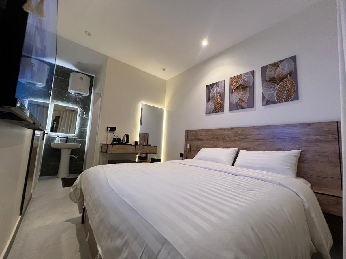 يخلق هذا المسكن الأنيق خلفية عصرية لإقامتك. غرفة صغيرة جدًا ومناسبة لشخص واحد او شخصين بالكثير، تحتوي على سرير، وتسريحة بسيطة، مع حمام خاص. المساحة محدودة ولا تتوفر مساحة إضافية، لكنها عملية ونظيفة ومناسبة للإقامة القصيرة فقط