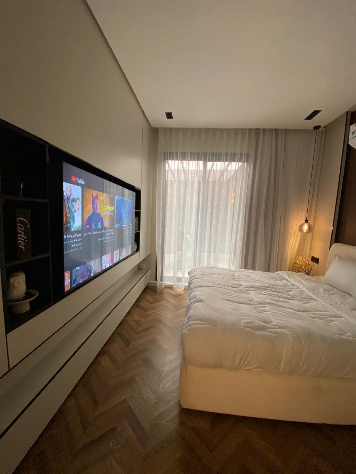 A modern apartment designed for an exceptional stay, located in one of Riyadh’s finest neighborhoods with a stunning view of KAFD. It features an outdoor seating area with a screen and projector for enjoyable evenings. For your comfort, the bed includes a high-quality 14cm extra layer. “We also offer event coordination services for special occasions (including cake and accessories) for an additional fee with prior booking, ensuring an unforgettable experience “