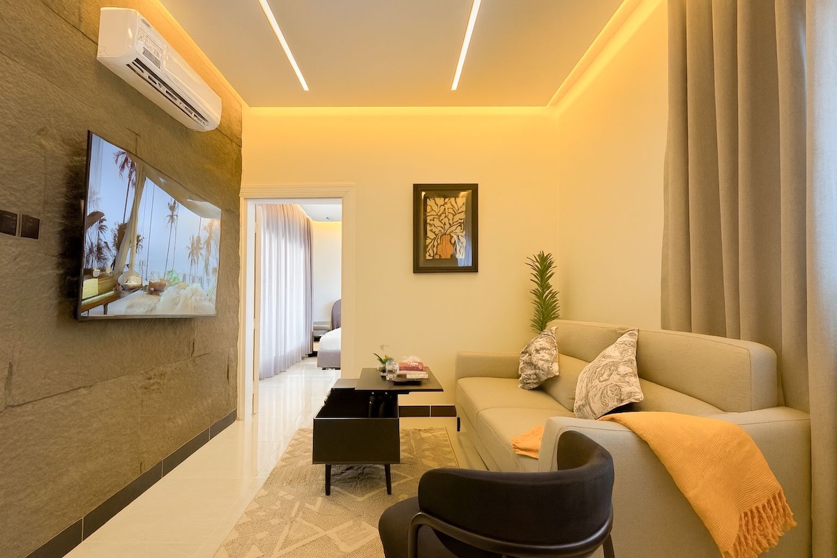 Luxurious, cozy stay in this Riyadh apartment featuring a glowing moon art piece, private hot tub, and a 75-inch smart TV with Netflix, YouTube, and Shahed. The space includes all essentials—fridge, microwave, and more. Perfectly located just minutes from major landmarks like Boulevard City, it offers both comfort and convenience. With self-check-in, modern design, and a warm atmosphere.