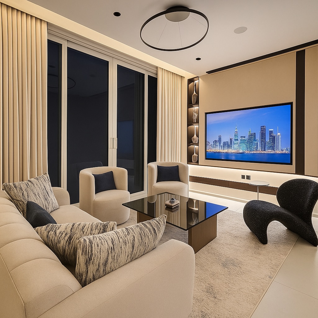 Apartment in Burj Rafal (owner's residence), 50+ floors, a northern view, for those looking for quiet and distinguished accommodation, near the most prominent landmarks of Riyadh. Fully equipped, designed and furnished with luxurious personal furniture; includes a bedroom with a master bed, a kitchen, (2) bathrooms. cinematic lighting, a washing machine, coffee machine, a 75-inch TV & large screen in the bedroom, air purifier filter, Kitchen tools to spend a period of stay in complete comfort.
