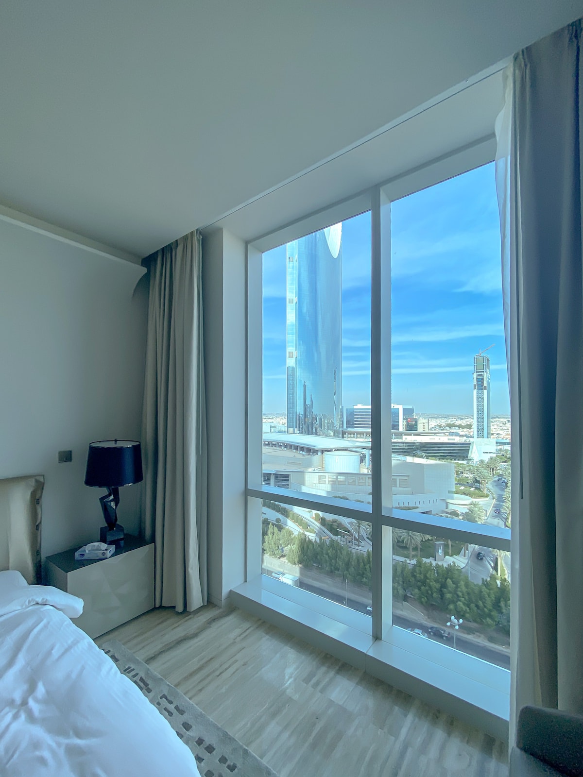 Brand new luxury 2 en-suite bedroom/ 3 bath apartment (non-smoking) with balcony in a high-rise building. Centrally located on King Fahad Road in upscale Northern Riyadh, within 5 min walk to Metro Station, Starbucks and restaurants. Apartment features: - 2 bed/ 3 bath - 2 private balconies - Self check-in - Fully-equipped kitchen - Washer/ dryer - Luxury, stylish furnishing - High-speed WiFi Building amenities: - Rooftop, stunning views - Private garage parking - Swimming pool - Gym