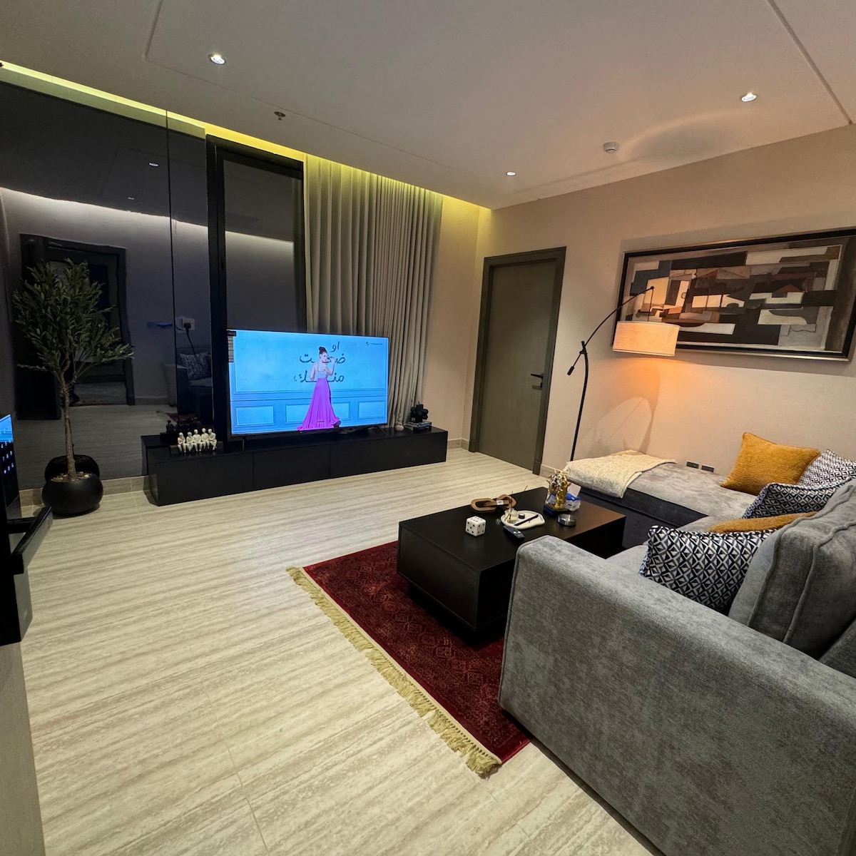A modern apartment designed for an exceptional stay, located in one of Riyadh’s finest neighborhoods with a stunning view of KAFD. It features an outdoor seating area with a screen and projector for enjoyable evenings. For your comfort, the bed includes a high-quality 14cm extra layer. “We also offer event coordination services for special occasions (including cake and accessories) for an additional fee with prior booking, ensuring an unforgettable experience “
