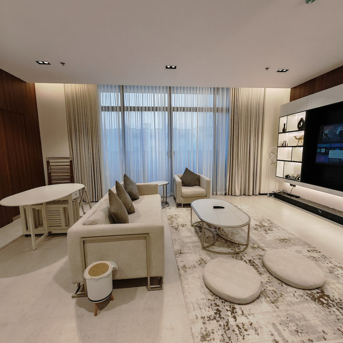 تقع هذه الشقة الفاخرة في قلب أحد أرقى أحياء الرياض، حيث تتناغم الأناقة العصرية والتكنولوجيا مع التصاميم الثقافية الأصيلة. تتميز الشقة بمساحاتها الواسعة التي تضفي شعوراً بالرحابة والراحة، وتتميز بتفاصيلها الدقيقة التي تعكس ذوقاً رفيعاً. جدرانها بأسقف عالية، تحوي حديقة وجلسة خارجية خلابة تبعث على الاسترخاء. تتميز الشقة أيضاً بإضاءة خافتة ودافئة تخلق أجواءً مريحة، وتحتوي على قطع أثاث فاخرة مصنوعة من أجود أنواع الرخام و الأخشاب. "تعتبر هذه الشقة ملاذاً مثالياً للاسترخاء والاستجمام والهدوء والذوق"