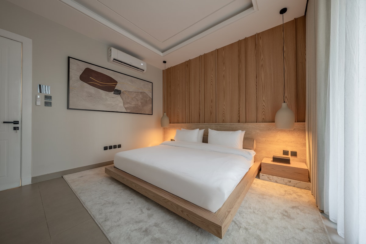 SOLID – Iconic Glass Landmark | Luxury Design Residence A refined luxury apartment designed with clarity and comfort in mind. Features two king-size beds with hotel-grade quality, a spacious living area with a soft white sofa, and an immersive 85-inch TV. Includes a dedicated work space, a fully equipped coffee corner, and a modern kitchen with all essential appliances. Set within a striking glass-and-marble building, offering a clean, elegant, and premium living experience.