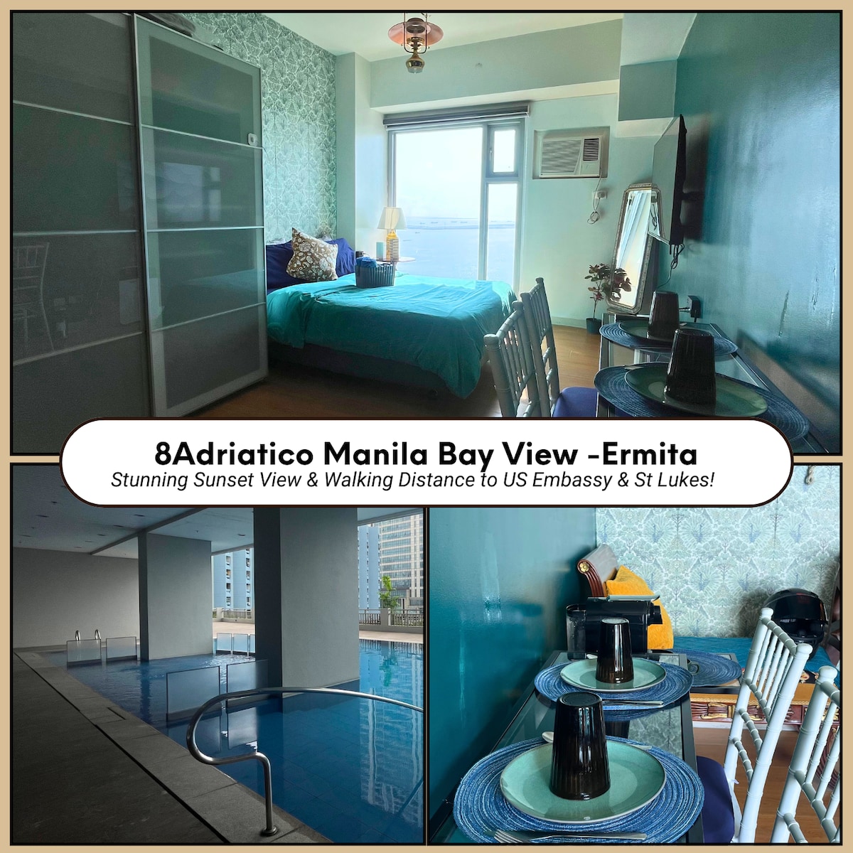 A scenic 1-bedroom w/ balcony, 24-hr security, WiFi, Netflix & hot shower. From the unit’s balcony, you’ll enjoy the amazing Manila Bay sunset view right in the old city’s historical and cultural locale. The location beside the prestigious De LaSalle University, is close to SM Mall of Asia, World Trade Center, Cultural Center, the US embassy & Manila City Hall. A grocery, ATM’s & restaurants are on the building’s ground floor. Swim in a lap pool as your exercise for short stays.