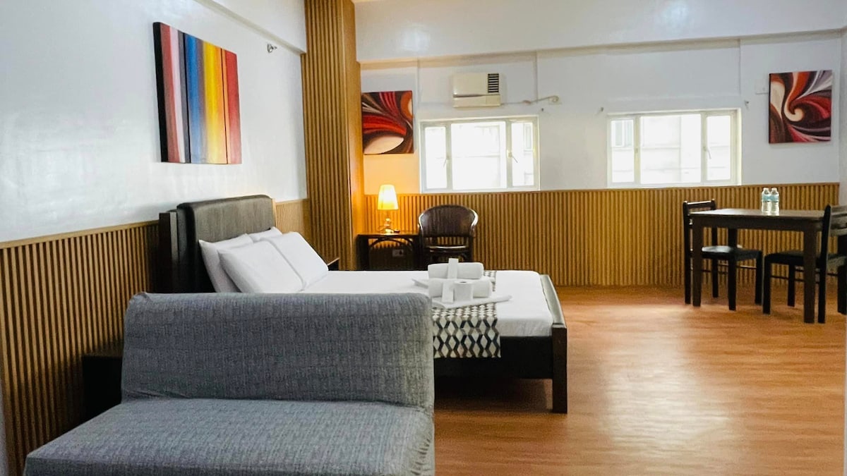 Spacious 27.23 sq.m. (~293.10 square feet) cozy and relaxing private hotel suite at 14F of LANCASTER HOTEL MANILA near PCSO Office, MRT Shaw, Shangrila Mall, Greenfield District, Megamall, Star Mall EDSA Shaw, and WCC See More... 🟩Cozy Hotel Interior Ambiance 🟩Queen Size Bed + Orthopedic Mattress 🟩Hot Bath Tub 🟩FREE Pool Access 🟩500 MBPs Ultra-Fast Wifi Speed 🟩43" UHD 4K Smart TV + Soundbar for Cinematic Sound 🟩Netflix + HBO Max + Disney Plus + Prime Video + Spotify 🟩Bluetooth Speaker