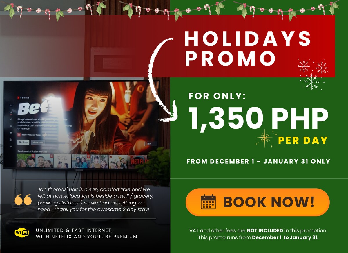 Welcome to your perfect city getaway! Nothing fancy, just another home away from home right in the middle of everything. Malls, restaurants, coffee shops, pharmacies, 7-Eleven, and supermarkets are nearby. There are taxis and parking slots, and the LRT is just a 5-min hassle-free walk (connected inside the mall) from the condo—convenience at its finest. *Check-In: 2:00 PM *Check-Out: 12:00 NN Don't miss out - book now! See you!