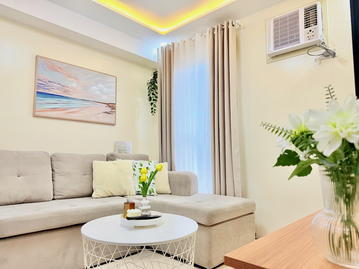 a big Air-conditioned 62sqm corner unit, stragically located at a main road with balcony opening at the pool. the place is few steps from SM Hypermarket for all of your needs and groceries as well as you will have a Well equipped Kitchen you can park directly under your place with A free parking at the basement Enjoy unli access to the pool and the gym the shower is with hot water, the Internet is 200 Mbps, you can all of your shows at 4k in the big smart TV